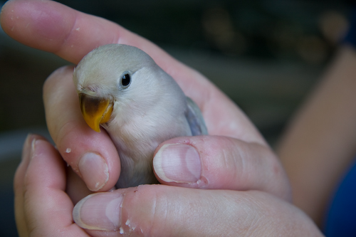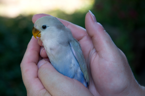 22. This is kind of a long story but has a happy ending so here goes As most of you know I work at a breeders/bird store (to my great happiness). I mostly look after the breeder birds, who are separated into 3 different rooms depending on size and species. There is one room that is completely filled with floor-ceiling flight cages - mostly containing finches and doves. However, there is one cage with about 20 lovebirds, who have been paired for a number of years and breed often. In the beginning of July, a little baby was born with a bad leg. Basically, her right leg stuck almost entirely out to the side and allowed her little to no movement as a newborn. My boss and I decided to put elastics around the joint to try and pull the leg in. We let her be parent reared for 5 weeks in the hope that she would learn from them and be able to move around better as a result. The elastics pulled her leg in a little and she was moving around the nestbox as time went on. But her parents seemed irritated by her age and her still being in the nestbox, and one day I went in for feeding and cleaning and discovered her curled up in a corner on the bottom of the cage. I caught her, checked her crop and noticed she had been eating on her own. We gave her 2 weeks to see if she would perch or adventure to the top of the cage. She didn't. I watched her struggle, and although she tried, she never quite made it, and as time went on the other birds began picking on her. It was at this point that my boss had a decision to make - he asked me if I would take her. Of course I said yes She has been here since Saturday and stopped eating Sunday. I handfed her 3 times/day until yesterday, when she finally adventured out of her snuggle hut to the food sprinkled on the bottom. I skipped her lunch yesterday and she's eating well now. She is an absolute doll and will cuddle all day and all night. We are working on hand taming her and she is doing remarkably. Today she sat in my hand and didn't fly away :laugh: She is climbing around today and playing with little wicker balls on the bottom of her cage. She seems to be happy and doing very well. My mum and I love her so much, and I think she has a bright future ahead of her Here are some pictures, her name is Luna and she is a Cinnamon Violet lovebird (very beautiful), hatchdate July 1/09.