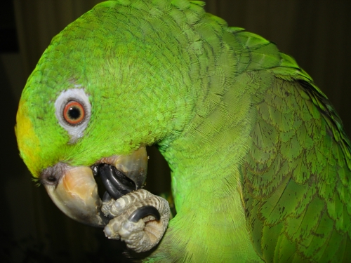 Hi, wanted to get your advice (especially from Jay and Maggie and Pat – fellow amazon parronts). I’ve had Sunshine, my 8 month old male yellow crowned amazon for 4 months now. About a month after he came home to me, he started molting his chest, neck, head and leg feathers. Then he stopped to catch is breath, and about a month later started losing the down (what a mess that was – those things stick everywhere LOL). Now he’s starting to lose the larger feathers covering his wings. What’s next – the flight and tail feathers, I presume? Anyhow, the interesting thing is that the small feathers covering his wings on and around his shoulders are turning black, not just around the edges but also some spots in the feathers. Also his tail feathers look pretty shabby. Jay and Maggie, I remember you mentioning that Salsa was also turning black some months ago. She was molting at the time. It’s hard to tell from your pictures – how is she now? I did my usual research and found that this is a loss of pigment and can be due to lack of sunlight and vitamin deficiency. On the other hand, they also say it can be from over petting. Well, I’m a bit guilty of the latter but it doesn’t make sense in this case because I pet him on his shoulders least of all…. Anyhow, there’s not much light in my apartment. I do have a bird lamp above him and I’m going to change the bulb this weekend (they say the UV only lasts about 6 months although the lamp doesn’t burn out). I also bought 2 kinds of vitamins (thank G*d for 24parrot.com – Northern Parrots on line shop in the UK) and I’ve started putting those in his food and water 2 x a week. It will take a couple of months I guess to see if it helps but I was wondering – could it be that it’s just because these are his first feathers and therefore not so durable?? I sure hope his next set will grow in well. All his new feathers so far have been fine. Your experiences and advice will be welcome! Thanks, Renate and Sunshine<br><br>Post edited by: HappyinGreece, at: 2009/12/22 09:44