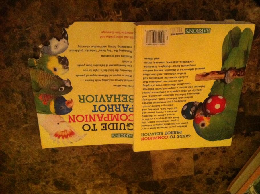 Omar is soooo smart, that when I bought a book to try to work on training him a little, he showed his appreciation by eating part of the front cover and first 14 pages. Since this pic was taken, he has eaten quite a bit more of the book. I think he's against this whole training idea. He marches to the beat of his own tweet.