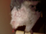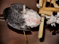 I have owned Ganesha for more like 2 1/4 months and she came to me from a breeder who was going to put her in sanctuary because she could no longer be sold. She was sold at 7 mos. and was wing trimmed at the time of sale. Apparently the new owners returned her five days later in this condition. I took her at almost 11 months after I lost my 10 year old Grey and all my 'tiels to a toxic oven liner. I have been working with her to try to turn this around but I am concerned that she is getting worse not better. My vet is great with her and she is extremely knowledgeable with plucking. We have talked about anti stress drugs and a collar because she will not let the new growth come in unharmed. She had several tail feathers still in the shealths and just wrecked them over about 3 days until they were blood feathers that had to be removed. She just turned one on Friday of last week. I have attached a photo I took tonight and a fuzzy one from before they had to pull the tail. She was tested for everything at her first baby visit and we were back a few weeks ago. I got some pain medication in case the new growth was bothering her too much because she seems like it could be painful. She will suddenly wrench her body around to her back or tail almost like a spasm with her neck craning out and a little cry. I get the meds into her when she will accept it and when it seems really bad. She seems worse first in the morning and later at night.