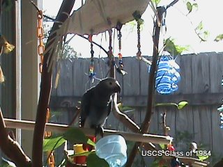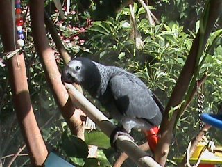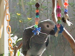 Gracie is now 5 months and 10 days old. She weighed 310 grams this morning. She is eating all kinds of fruits and vegetables along with her pellets and a few seeds. She is still taking a night hand feeding of 20-30 cc. After that she loves to snuggle on my chest for a while then to bed. She is starting to forage in her cage. I have a couple of foraging toys for her. She loves to shread paper. She has gone on several outings with me in her bird packpack (adventure pack)and really seems to enjoy it. She has learned to step up, step down, and turn around on command. We are now working on putting bird coins in a box. She seems to prefer the red ones. With a little encouragement, she will lie on her back while on my lap for a short time. She will let me touch her all over her cute little self even under her wings. Today she was making the CUTEST baby sounds. She would make a sound I would say something to her and she would seem to try and answer. Just sounds, like baby babble. She is doing well in the shower. She gets totally soaked and seems to take it in stride just as my other fids do. My Sun conure is doing better. I moved him away from the others (CAG, YNA, and Tiel) but still in the midst of all the house action. He is near the fish tank and loves it when I feed the fish. He is much more calm and more like himself now that I have moved him. She also loves to sit outside as you can see in the picture. Have a greyt day Annie PS...Just a fun note. I work in a medical office. A patient came in with a service Monkey. It was a Capuchun monkey. I got to hold it. It was like holding a real baby. It was AWSOME!