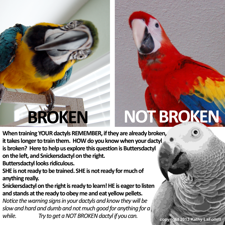 Keep this post going...There are more than 12 subjects that new posts could be made... THIS is Luvparrots Post.... Posted January 22, 2013 (edited) Some things you need to know (just the tip of the iceberg): 1. Parrots are not domesticated. Domestic animals have been bred for hundreds of years to live in the care of humans and as such are distinct from their wild ancestors. Parrots normally have long lifespans which can range from 20 to 50 years or more. Being owned by a parrot can be a life-long responsibility. 2. Parrots, particularly cockatoos and African greys continually shed feather dust or dander which may aggravate asthma or other breathing problems in some people. Many homes with pet parrots have hepa-type air filters installed to control allergies or respiratory problems from bird dander. 3. Parrots are normally noisy. Squawking, chirping and imitating sounds are an important part of any parrotโs social communication. Parrots are active and inquisitive creatures and must be provided with ample safe space to flap their wings and move about . Safe wooden toys and clanging stainless steel bells are a must for a happy, healthy parrot. Having an unhappy bored parrot is detrimental to its health and the health and peace of your home. 4. Parrots eat continuously throughout the day and think nothing of dropping, tossing and flinging food everywhere. In plain words parrots are quite messy. 5. Parrots instinctively chew and shred wood and can be very destructive. Chewing electrical cords, window blinds, curtains, kitchen cabinets and other household furniture seems like great fun to parrots. You must be vigilant and observant if you want your cabinets, woodwork and glassware to remain intact. 6. Parrots must be provided with ample healthy foods and a varied diet. A parrot cannot live on seeds or pellets alone and should also be given an ample supply of grains, beans and leafy green vegetables as well as some fruits sparingly. 7. Light exposure is a necessity for a healthy parrot. Parrots must be exposed to Vitamin D from sunlight or at least full-spectrum indoor lighting on a regular basis. Vitamin D promotes Vitamin A absorption, which is critical for upper respiratory health. Parrots must always have a minimum of 10 hours of sleep at night. In the wild parrots normal bed down from sundown to sun up. 8. Parrots are very sensitive to air quality. A parrot replaces nearly all the air in its lungs with each breath. Because no residual air is left in the lungs during the ventilation cycle of parrots, they transfer more oxygen and more pollutants during each breath. Parrots should not be exposed to tobacco smoke, hairspray, household cleaners or other chemical fumes, and most definitely not Teflon coated overheated materials. Exposure to toxic inhalants can cause immediate death in some cases and premature death in others. 9. Parrots are often compared to human toddlers in their need for emotional and social nurturing but unlike human children, parrots never grow up. Parrots are very intuitive and nosey. If they see something they like they might inspect it including moving ceiling fans and large glass windows. It is up to you as the caretaker to keep parrots safe from their own curiosity. 10. Parrots are prey animals and therefore hid any illness. You will need to be very vigilant and be able to read your parrotโs body language for any unusual changes in eating or other daily habits. Proper avian veterinary care for parrots can be very expensive. You should think nothing of at least $100 โjust to walk in the doorโ on your first veterinarian visit. 11. Before you bring home a parrot ask yourself: Do I have quality very day time to spend with a parrot. Am I ready to raise a toddler who never grows up. Perhaps this parrot will choose someone else in the family to bond with and dislikes me to the point of daily bites and nips. Will I be unselfish enough to continue to love and care for this parrot all in the hopes that someday this parrot will at least tolerate me. 12. If my parrot should outlive me, do I have someone in mind to care for this sensitive and intelligent parrot after me. Good luck in your decision. I made my decision 5 years ago. I am now owned by four (4) birds: 2 greys, 1 amazon and 1 male singing canaryโฆโฆ and loving it! (Note: I am no expert. This is information I have gathered from personal knowledge of owing 4 birds; from reading posts in the Grey Forums; and from reading numerous books about parrots and different published articles. In other words, things I have read from here, there and everywhere.) These are my opinions and others may not totally agree with what I have written. Edited May 13, 2014 by luvparrots