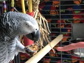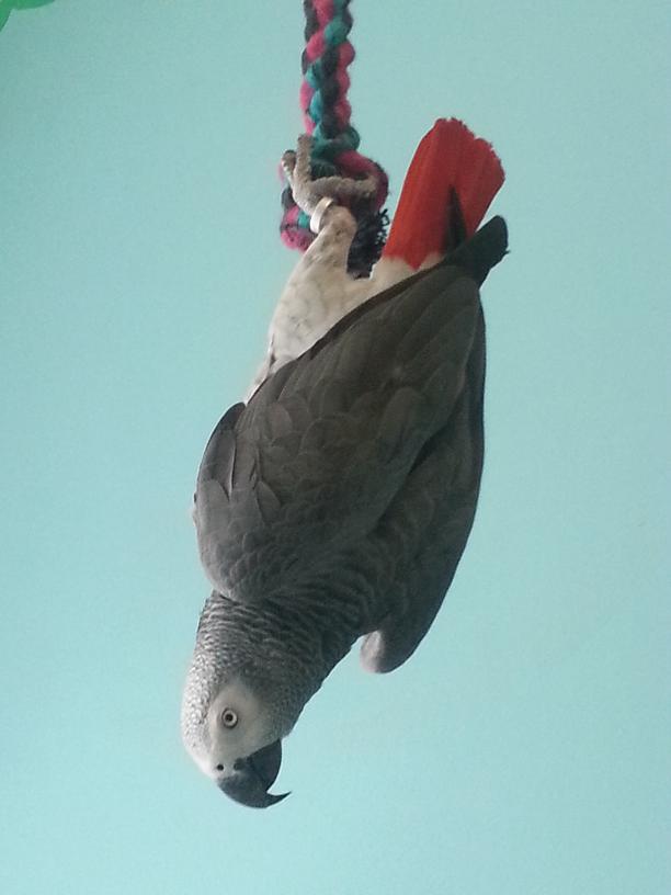 One of Slater's favorite things to do is to swing upside down and/or hang like a bat. (Must be a grey thing). If I am busy in the birdroom I'll look up from what I'm doing only to see Slater just hanging on the end of his rope perfectly still waiting patiently for me to look at him. As soon as I look at him he flaps his wings wildly (still holding on to the end of his rope) and swings back and forth almost touching the ceiling! I have some bells and toys at the very top of the rope and when he swings back and forth it makes lots of noise which he loves to do.