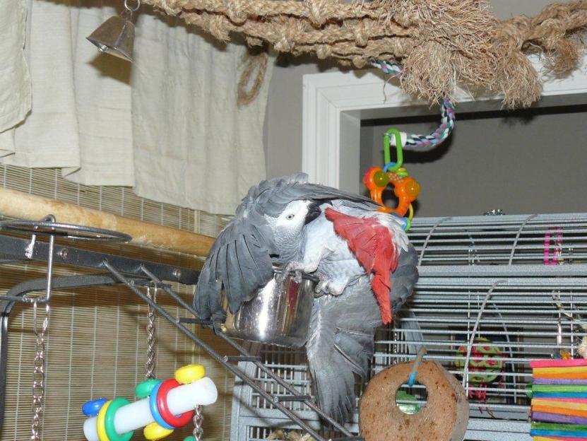 Slater has this chirp he makes when he is trying to get my attention or he wants to go somewhere and can't (he's flighted but still thinks he can't fly) or when he is nervous. It's a single sharp chirp that is most nerve-wracking to me. If the chirping alone doesn't get him what he wants he starts flapping his wings in addition to the chirp. He's been doing more of this type of stuff lately. Yesterday morning I was making him breakfast. He seemed fine. I need to post pictures of him hanging upside down on his stand like a nut just before I served him his breakfast. I prepared him some oatmeal with some blue berries and some fresh veggies. I placed the dish on his stand and OMG he flew off and around the house like a bat out of hell. I think it was because I put the oatmeal in his dish and I don't normally do this. Everything else he is used to seeing in his dish. Now he is hesitant about going to that side of the stand. He's always made this chirp and I have been trying to ignore it. Seems like he has been overly nervous lately. I feel that whatever I do does not make him happy and I don't know what to do next. I am almost at my wits end with his chirp. I can handle the sometimes ear-piercing screetches, the continuous whistles, honks, gutteral sounds and various other noises from the both birds going at it all day long that doesn't bother me but this one chirp from Slater is most irritating. So could this be a hormonal thing and will it pass?