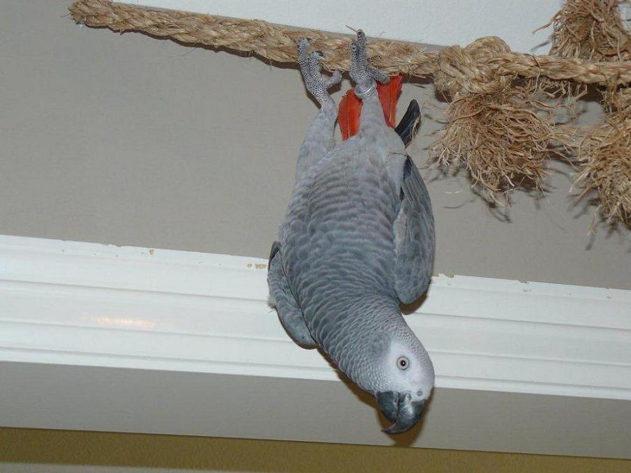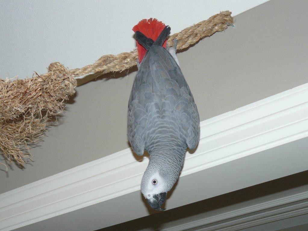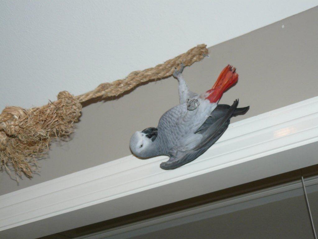 I was vacuuming the birds area on Sunday. Whenever I vacuum the birds get all excited and start talking and carrying on. Slater likes to bathe. He thought a bath in his water bowl was appropriate. He hardly got wet but that's ok he was having a GREAT time. Here he is doing what he does best hanging upside down like a feathered bat-lol. He is sooooo silly sometimes. Enjoy!