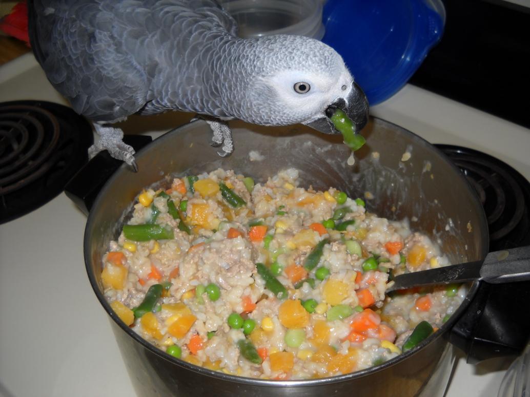 11. About once a week I make a big pot of homemade dog food for my older dog that has liver disease. Biscotti is never allowed out when I am cooking anything on the stove. Long after it was done cooking & chilled down I was preparing to scoop it into plastic containers to freeze & Biscotti decided he had to check it out. He must have thought - Wow!! Now there's a lifetime supply of birdy mash! :cool: Of course he had to sample it and he liked it ! Silly boy now he barks & eats dog food!