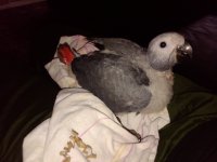 Definitely can't! I have wanted a grey all of my life (a whole 27 years! lol) so this is a big accomplishment for me! A big adjustment as well since I have 2 new cockatiels and a 7 year old dog at home! The dog tries to interact with the tiels so I am hoping he will become good friends with the grey as well. The tiels aren't tame yet, so it's hard for my dog to become close to them. If anyone has any tips for me, I am worried a little about socializing. I live alone and don't have many friends. I rarely have visitors to the house and when I do they aren't bird lovers like me and probably won't interact with them. I am also concerned when my dad comes to visit since the cage is out in the living room, where my dad will sleep. He hates birds! The cage is too big to fit through my bedroom door, so I can't move the grey temporarily. Would it be ok for me to get a small cage or a play stand for him to sleep in/on sometimes? I also need to find a way to move him into my room on pest control days since my apartment has the pest control people come once a month to spray indoors.