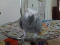 Buster a 7 yr old CAG has been with me for two years now. His owner, a life long friend got sick and went up north to be with family for a while. I had previous bird experience and was baby sitter to Buster previously so it was like taking in a bird-nephew. We actually bonded fairly quickly and Buster was a happy healthy member of the family that enjoyed being in whatever room I was. His colors became perfect! He learned how to fly while with me and was starting to get into fun teaching sessions in which you could tell he was really trying to learn. He loves to dance to everything from The Jeffersons Theme song to Rhianna! His real dad came for one visit in those two years. That visit was the only time Buster ever bit me. Right on the lip! (Which ended our lip kisses)