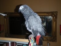 I met this old man who would come in and play with the dogs at my work in his free time. He lived alone, except for him goffin. He would come into my work and talk for hours and hours. I later found out he lived right down the street from me. Well, this past week he had to go to the hospital, and is now on his way to Miami for open heart surgery. He told me he doesn't think he is going to live, and that his bird is being boarded at animal house under my name. We talked for about two hours over the last three days on the phone, about his bird. It is his life. So, I went to pick up the bird at Animal house last night. She's the sweetest bird ever, LOVES attention, and crys if you walk away. At Gene's house, she NEVER stayed in a cage. She was fully flighted, and did as she pleased all day long. I guess Animal House clipped her wings. (I'M SO ANGRY WITH THEM, BTW) She also has to stay in a cage when we're not around. We have other pets. Any advice to comfort the bird while we're not around? We're feeding her the grey pellots and a little seed, she seems to only eat the seed. We are housing her far away from Stazel and Beanie, which btw, both of them seem awfully angry and moody. What kind of toys do they play with? Same as Greys?