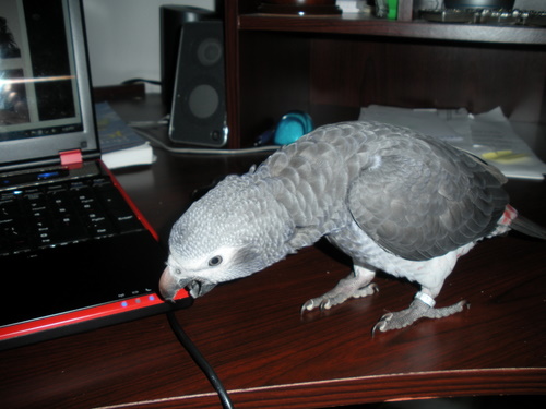 Lol, I caught this picture of Yoshi while trying to take pictures of her attempting to keep her wings lifted up... I think she is trying to sabotage my computer! Lol luckily she hesitated instead of biting through my power cord!