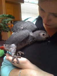 Omar made it in one piece, I wish I could have taken him myself from California, but had too many things going on here and my breeder said not a problem as she ships all the time. It turned out to be a 7 hour flight with a stop in ATL thanks to Delta...he seemed very done of his travels on the car ride back into the city. Got him home and he came right out his box and straight to my hand. First day was good, he was very quiet and checking everything out. Yesterday he was such a love, just wanted to be held all day and chirped if I left the room( the pic I included was from yesterday when he crawled up my chest and demanded I rub his head for an hour). Today he is not really wanting to be held and turned his back on me during his naps (which he never did in the 2 days) which made a little sad. But my mom said Greys have these little moods, so if you all can reasure me that will make me feel better.