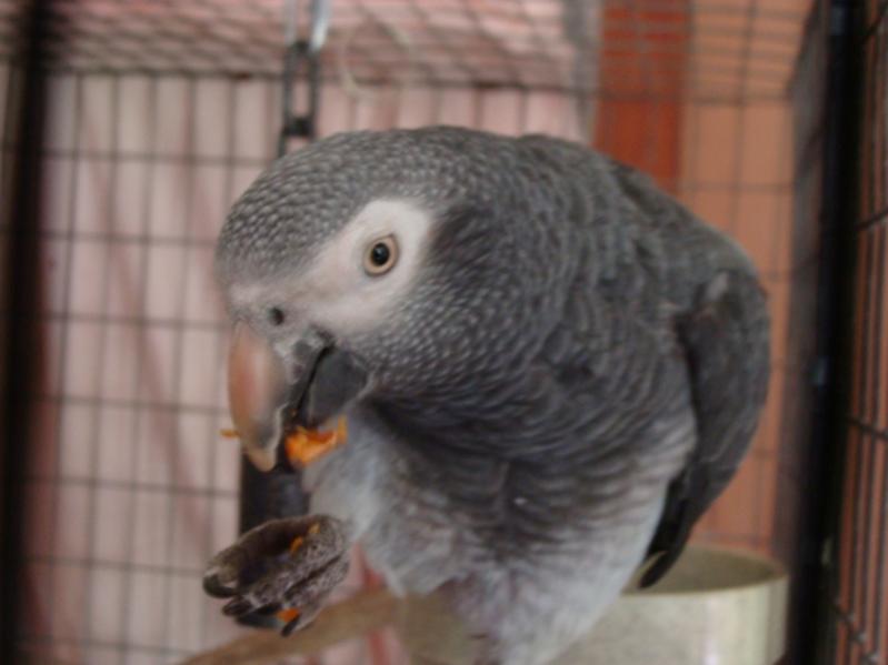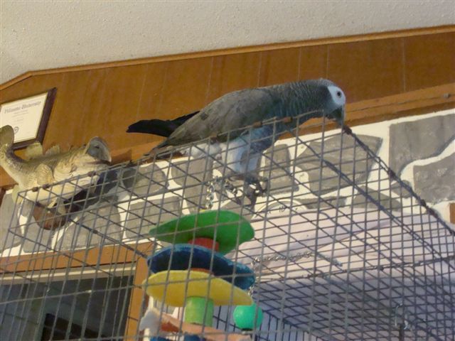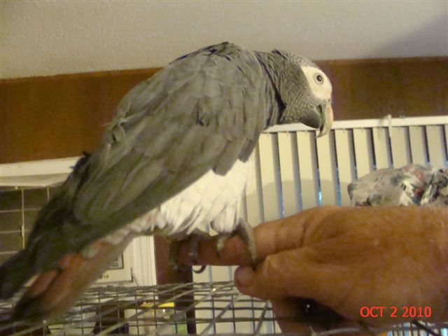 Greetings everyone ! God works in mysterious ways. I told y'all that Cocoa was birdnapped by previous owner, and is gone after 9 months with me. This past tuesday I finally moved the playstand I built for him from the dining room table and was going to put his cage in storage when my wife got the call............ A friend of a friend of hers heard about what happened to Cocoa and had a friend who has cancer and is going through Chemotherapy. Well this Lady, needed to find a GOOD home for a Timneh African Grey Parrot. We called and arranged to meet the owner and the bird to see if the Parrot wanted to adopt Me. SHE LOVED ME ! Cheryl, the owner couldn't get over how Zoeie took to me. I didn't see anything special about the meeting cause the bird made no fuss, let me touch her beak and feet through the cage and Cheryl said she usually will not let anyone even touch the cage , let alone her feet or beak ! So after about an hour of chit chat She asked if I wanted to have Zoeie. I told her only if I could spoil her rotten, and that bright light y'all saw over Central Florida yesterday was not the sun, it was our Smiles as we both were overcome with happiness. So even though I was done wrong by one person, God was evidently preparing me to put a smile on a very special woman's face in Sanford Fl ! Now, while Zoeie was in a very good, loving home, she has never been "worked" so I have a long road in front of me as I work to gain her trust and build up her confidence in me. She already likes my cooking as here she enjoys her first breakfast with me , a piece of a Harrisons and egg shell omelet she took from my hand this morning. Have a greyt day ! Lee