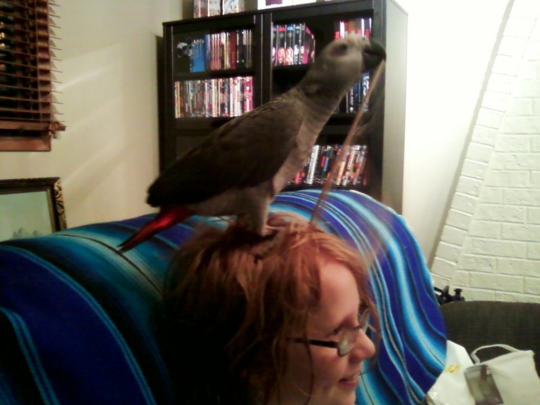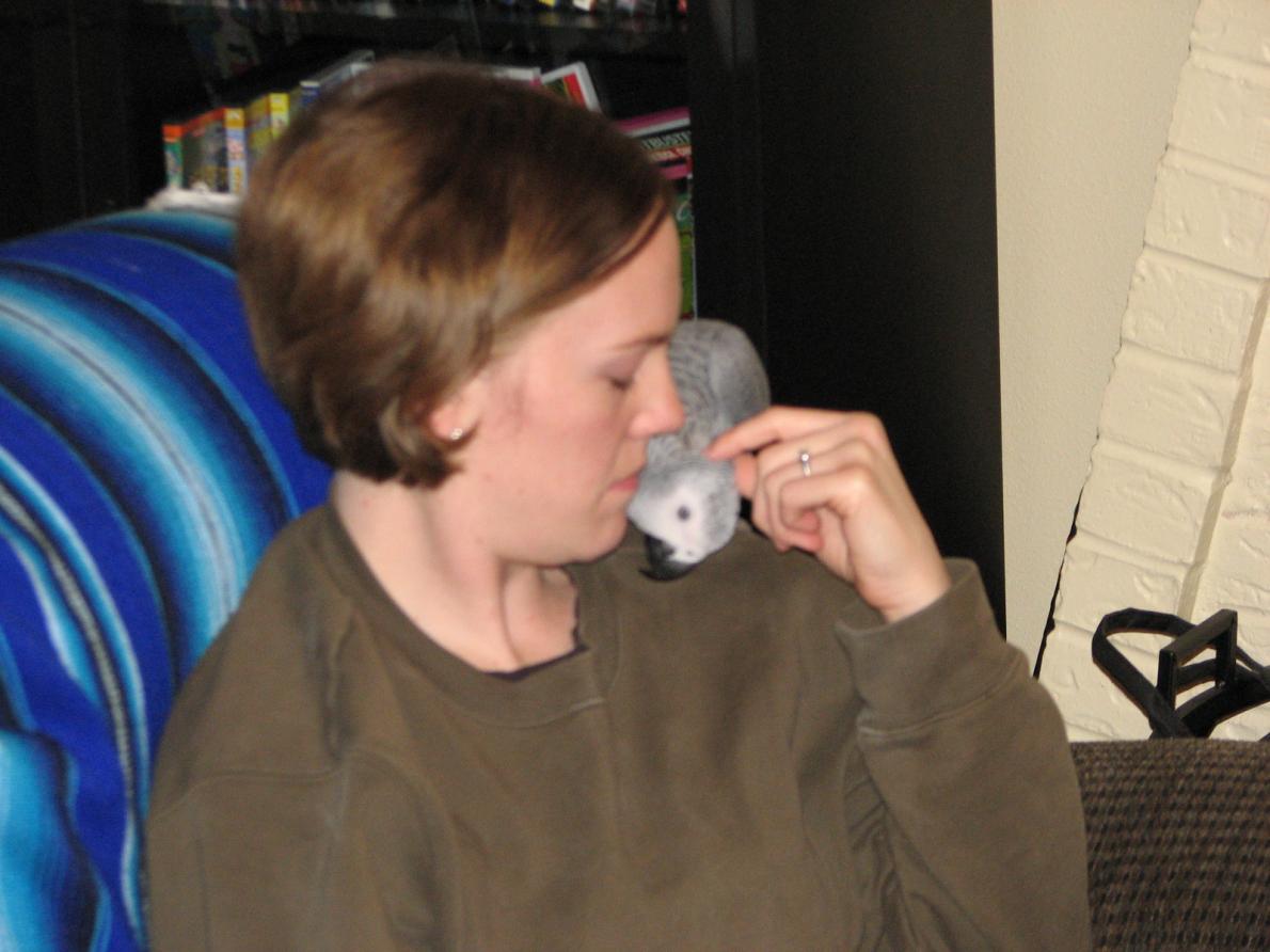 He behaves himself all the time on my shoulder always beaking my face and preening my hair....my concern is he likes my earings and I had to fight him the other day because he pulled it out and I thought he was going to swallow it. Also, he cant seem to get a grip on my shoulder so I have to pretty much turn into a statue. If I could walk around or even just sit "normal" and he would leave my earings alone then I wouldnt have a problem with it. : ) I have tried to have him sit on my arm when Im on the couch or on my lap but that doesnt work either.