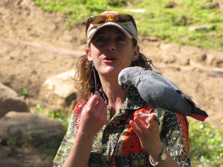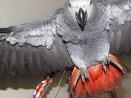 So I would have to say that this is the week of least change. He continues to make this sweet sound that I love to hear "Whoop Whoop Whoop". I giggle everytime I hear it...especially love it when he does it next to my ear. Over the weekend he was on his atom and got completely on his back resting in the cradle of the bottom with his feet in the air playing with the toy in the middle. I was impressed. Reagrding weaning, he still takes his morning and evening forumlas even if its just a little bit. Does anyone think I should discontinue his morning feeding, or should I hold out for total refusal? There is such a pattern that I feel like he will always expect the feedings. Should I maybe offer veggies and other things before I give the formula? He loves to hang out on my shoulder, I can say this for certain. Thankfully he is a total angel when he is there and behaves. I was playing video games on the couch with him on Saturday, and I look over and he has his head tucked in on his back and he is sleeping. So apparantly, I make a good bed. How sweet. Still working on the shower. I know I have to get him wet again soon. It is not his favorite thing to do I am sure, I can tell by the sounds he makes. He does a pathetic little decending 'coo' like, "No, please". Sugar snap peas are still the top of the list of veggies. He loves em. I have some thick pasta I am going to cook up for him tonight. He seems to like noodles. He also seemed to like Cheerios, are these okay for them? That's all I have regarding my little sweet bundle of feathers for now. My daughter and I went to the Wild Animal Park here in San Diego and saw the bird show where they have none other than a smart Grey named 'Congo'. I told Issac that I saw one of his brothers that day. There is a pic of him below. He could make animal sounds and say some words...over all a very sweet bird. Greys are beautiful <br><br>Post edited by: Elvenking, at: 2010/03/15 19:27