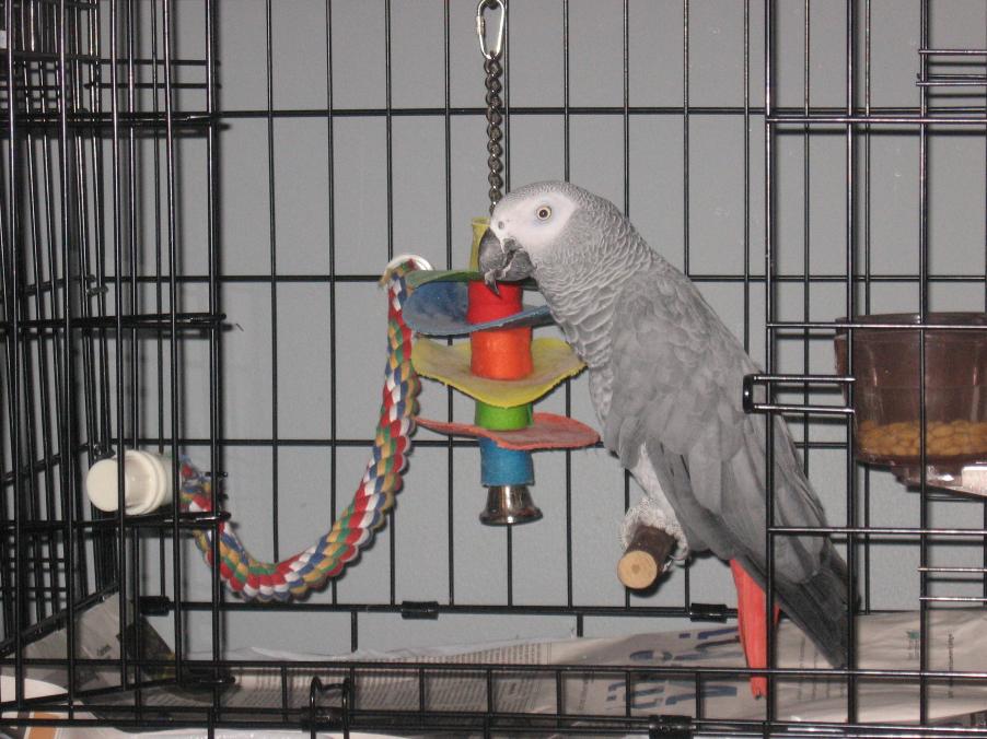 Shasta our nine year old congo, has offically been renamed Cooper. Well, okay let's say for the next few weeks his name will be ShastaCooper, and eventually we are going to drop the Shasta. He seems to respond to Cooper just fine, but as anything else in Greys, you need to take things slow. Also... his "travel cage" arrived today... (just a doggie icrate I turn into a portable parrot palace) and he really likes it! All the comforts of home... lol! Btw, if any of you have never traveled with your birds, I HIGHLY think you should give it a shot! It's a little time consuming on the planning aspect, but it's so very worth it.