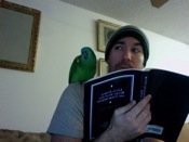 Hunter is doing great today. A little contact calling but other than that he's a really mellow bird. His spot on imitation of a telephone means its time for me to get up. The Amazon and Hunter are totally fine. I thought this would be the point of contention because the Amazon is so fiercely territorial about the apartment and my fiance. Hunter imitates the Amazon. Its kind of hilarious because he says "HELLO AMY!" in the amazon's voice (something the 'zon says non-stop). I let them get pretty close to each other but I don't let them sit on the same perch for fear of beak battles (I have a rolling perch for w/ food+water bowls and toys I can take to whatever room I'm in). Hunter is a little curious about Amy but otherwise doesn't really care one way or the other about him it seems. They both like hanging out while I read cases and briefs/ write my thesis. The Amazon is pretty indifferent to Hunter. The Amazon sings, makes his usual demands for shoulder time, and goes about his bird business.