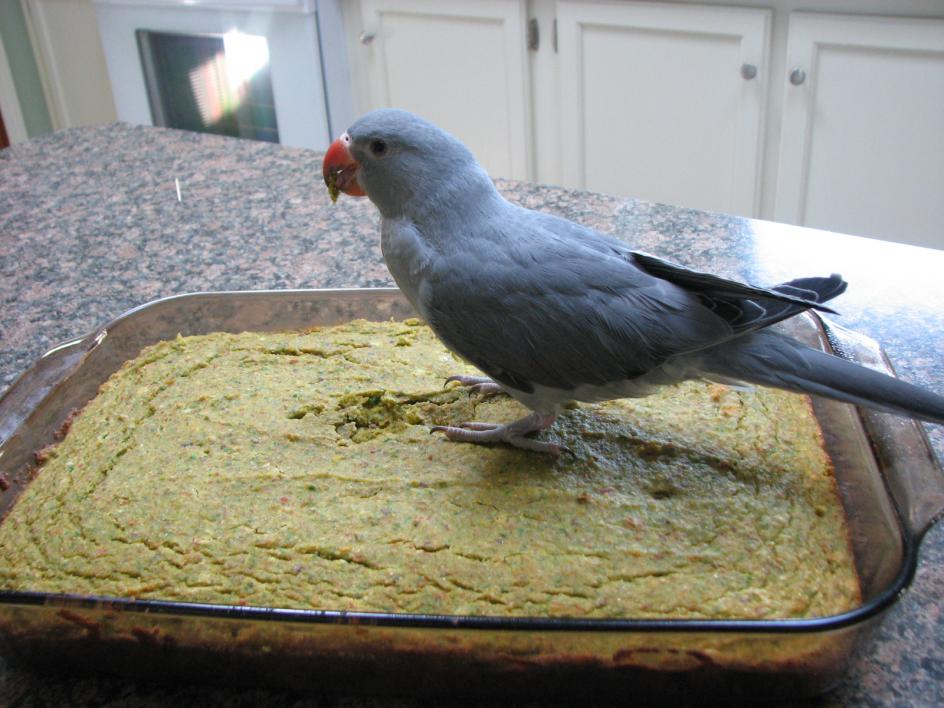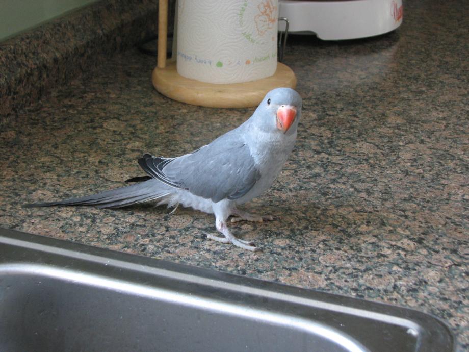 Thank you, he's a real sweety. Here's the pizza video. I was coloring some blocks for bird toys and my son came in to get some cold pizza out of the fridge. This one I had just made a batch of bird bread and he wanted a taste of baby food. This is one of Sarge in the sink taking a bath. Then you hear some screaming and weird sounds in the background, that's Paco, one of my CAG's..