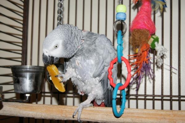 It's been a couple of weeks now so I thought I would drop in with an update. Seuss is doing great. we are noticing a lot less feather picking except when things change around her. Like new toys, or people. her chest feathers have started to fill in a little bit and appears to be doing more actual preening than picking. We have been doing the aloe spray baths every other day till she gets more used to them. She gets a little miffed at me when we do them, but comes around pretty fast. Her skin seems less flaky too. We have been finding her favorite fruits and veggies, which has been a challenge. She loves grapes, oranges and apples pretty good. She will et carrots if shes bored, lettuce of any kind is a no go, Broccoli she eats the stems off and the rest goes to the floor. Banana chips are a big favorite and will tear down walls for a good peanut. The first toy we got her was a coconut shredding toy. It made it 3 days until she decided she would play with it, then it survived mere hours. I came home and found a pink pile of coconut fluff in the bottom of the cage. Today we made a trip to Petsmart, then Petco, then to another Petsmarts, none of them had any selection to speak of, but i still managed to spend $150+ on Food, toys, bedding and perches. I brought the new toys home, and played with them ont he couch till she showed interest and no fear of them, she is now in her cage checking them out slowly. We also got her the Polly concrete perch, and within a couple of times on it, I no longer have to bleed when she sets on my hand. We have also been learning since she is getting more comfortable that she is really a ham. She will set on my shoulder when company come in a her and I just chat back and forth and make noise, like she wants the attention....go figure with a grey LOL. Well that's all for now. Kevin