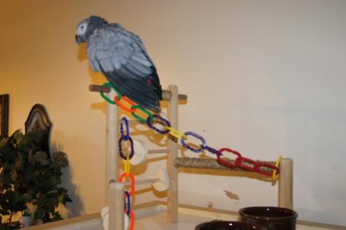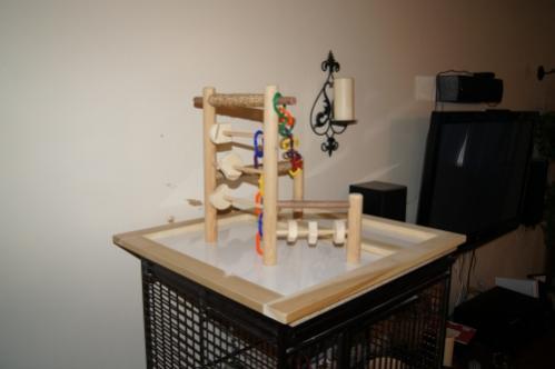 I just joined the other day and perused the site. I found a ton of great ideas for a play gym I wanted to make. Some of them are amazing, in scope and size. I stayed small for my first gym, first of all for cost, and second of all that my CAG is very skittish with anything new right now. We are working on that though. SO I just dug around my wood shop and found some dowels, a white board and some chunks of wood and made a small play gym for the top of the cage. After a little coaxing she went right to it.