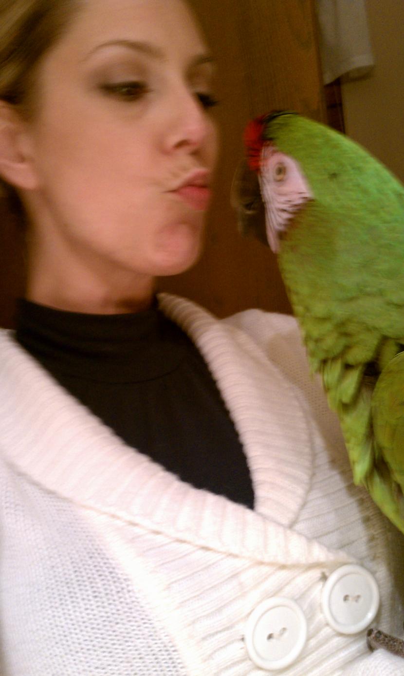 Hi all, My boyfriend and I recently adopted a Greenwing Macaw after losing our Military Macaw to a stroke. Paco is 9 years old and has never been handled. He lived in a cage and was taught as a baby how to take shots of tequila. So far, he has been wonderful, only screaming when I walk out of the room. The rescue told us that he prefers men, but he will only talk, play and sing with me. However, he will only let Jeff into his cage to clean. He's been home with us for only 3 days now. Last night, he surprised us all by asking Jeff to pick him up. Here is the result: Thanks for letting me share To think this guy would have ended up in a sanctuary where he would never be handled makes me even more proud to have him as a flock member. ~Amanda