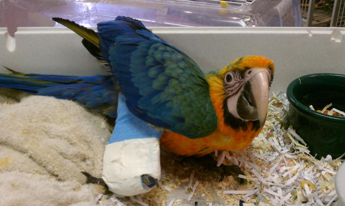 If you read my "Breakthrough" post, then you know about Annie, the Catalina macaw baby who broke her leg. Well, her leg is healing well and I went in today and took her a new toy. I rigged her cage with wooden dowels and she is using them to get around with her beak. I hate that the people who were gonna take her don't want her now. Jeff and I are considering bringing her home. Isn't she purty???