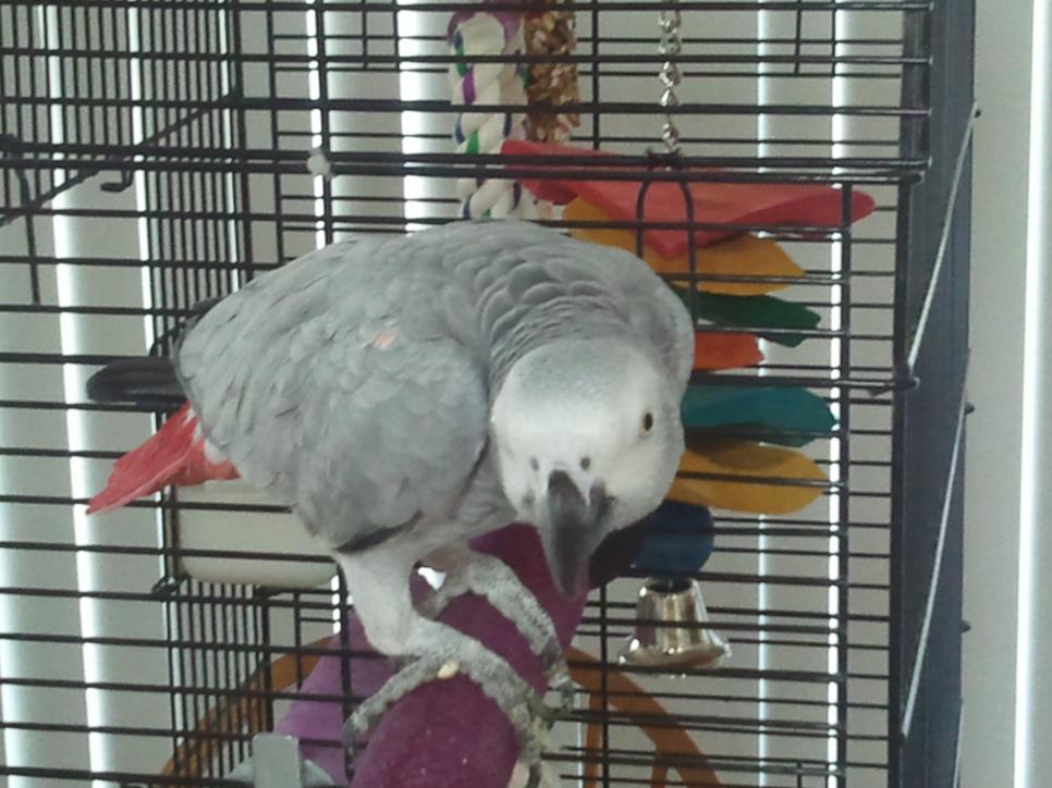 Her name is Annie. Here are a few of her pics when I attached a perch to the outside of her cage for her to relax on and have some room to stretch, until I can get down to Home Depot to buy parts to make her a DIY perch.