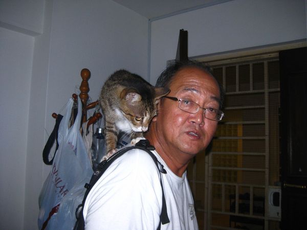 We were living in Hongkong in Saikung, a tiny fishing village in the New Territories in 1994. The apartment was tiny as were most of the apartments in Hongkong. However, the apartment opened onto a huge balcony as we were on the third floor and a seafood restuarant was below and their roof was our balcony. When apartments in Hongkong were priced as to whether you had a sea view or mountain view, when on the balcony we could look out onto a sea view or turn to the right and enjoyed the mountain view. We then thought of having kitties. At that time, we were reading the Vorkosigan saga by Lois McMaster Bujold. Where the two key characters were Miles , a clever manipulative guy who happened to be a runt caused by a poison gas attack on his mother when he was a fetus. He had a big handsome cousin called Ivan who was kind of stupid compared to Miles. We went to this guy who rescued 2 kittens from municipal bin. One was a runt who appeared to be intelligent and the other was a handsome tabby. So that was how Miles and Ivan came into our lives. Soon we found that Miles was the idiot and Ivan was the very clever one. They took over our balcony and then our apartment. They would explore by jumping out of the balcony and running about the roof and into places I could not imagine. One day I tossed Ivan over the balcony and told my wife he would jump back. He disappeared and a couple of hours to our shock, there was this meowing outside our door. Ivan somehow went around the apartment block, walked up a few flights of steps , and knew the door of the apartment to meow outside. Ivan was a killer. He would chirped like a bird hidden behind the balcony and leap 2 meters up to catch birds on the wing. He left presents for me by my bed. The head, with 4 small paws and a tail in the proper position and something ickky between them. Excuse me if I did not describe that exactly as I looked away while cleaning up the mess. He might leave a bird or part of a bird. He would climb up and pretend to be stuck in the roof eaves meowing away pitifully to be rescued. When I got up to rescue him, he crawled backwards. I realised he was never stuck when meal time came and he jumped right out. One morning, we woke up to hear a strange sound. We then traced that sound to a tiny baby bat which could not fly. We were sure that Ivan must have taken the mother bat. I felt sorry enough to rush out to buy a bird cage so the baby bat be kept safe until it could fly again. I fed it with bananas. One morning I woke up to see that the cage door was opened, without Batty inside. I thought that was the end, especially in the apartment with Ivan the killer cat and two feisty kittens that my wife adopted a few weeks ago. Then I heard the squeaks and saw Batty hanging upside down from the edge of a suitcase. Batty was in between Ivan front paws. Ivan was positioning his body so the 2 kitties could not get to Batty to 'play'. I could hardly believed my eyes as now and then, Ivan turned and spit at the two kitties keeping them away. Ivan saw me playing enough with Batty to decide that Batty was family. And went on to protect her. Batty was placed back into the cage again. Her flights at the beginning was weak and erratic. Batty seemed to like me and hang about me when I did my thing. Her flight became more controlled and powerful. In a few weeks time, Batty flew off my balcony. Never to return. It struck me that Ivan knew who was family even if he was a killer. That was the incident that prompted me to decide if Tinkerbell could live together with Halftail the Bimbo and Zorro the ferret in Taiwan. And later decided that Dommie and Katie be introduced slowly to Riamfada. Ivan was also kind of psychic. I reported that in http://shanlung.com/ivan1.html Miles was chased away by a vicious neighbourhood tom cat. I trapped that tom cat and released him in another village 20 km away who complained in the papers rock pythons were eating their dogs and cats. I did not like pythons to be hungry. So that was why Ivan was with us and taken to Singapore where he lived with my mom in law periodically when we were living in Taiwan and other countries. When he was with us and I in Singapore, you seen how I would cook and prepare his meals. You have seen the way I prepared the food for him, even better than what I prepared for myself or for my wife. https://www.facebook.com/shanlung We both love Ivan very very much. Above is Ivan on my shoulder. That was during our return to Singapore in Oct 2004 after leaving Tinkerbell and Taiwan and fetching Ivan back from my mom in law. I thought he forgotten me but his leap up to my shoulder to curl himself around my neck showed me how much he love to have me back. That was the first time he did that to me. A couple of weeks ago, my wife told me that Ivan might be getting blind, banging his way about and not noticing my wife waving her hands in front of him. She told me Ivan did not seem to be in discomfort and able to find his way to the food, his litter box and his favourite sofa chair that he taken over. A few days ago, my wife told me Ivan seemed to be getting weaker and weaker. Then two days ago, my wife said Ivan refused to eat even though my wife spooned the wet food to his mouth. And that he wedged himself into a tight space. I told my wife to carry him to the bedroom where he spend so much time with us. This morning Riyadh time, and about noon Singapore time, Ivan was still alive. My wife did what I asked her to do. Scritch Ivan head and tell him that was from me and I love him very much. She then went to work. I called her about noon my time when she was just getting back to the apartment. She told me that our Ivan was no more with us. She told me a bit of her died. I felt a bit of me died too. They had been times I thought of leaving KSA and Ivan was part of the reason. Even though I felt that was coming over the last few days, the ending was very painful to me. I am happy enough that Ivan was not in pain 