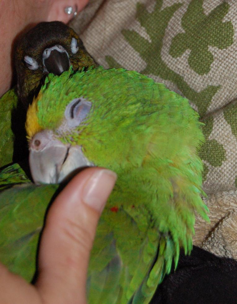6. The green cheek is always on her back..lol. Lola is just snuggled up. Sami had been preening Lola and finally fell victim to sleep.