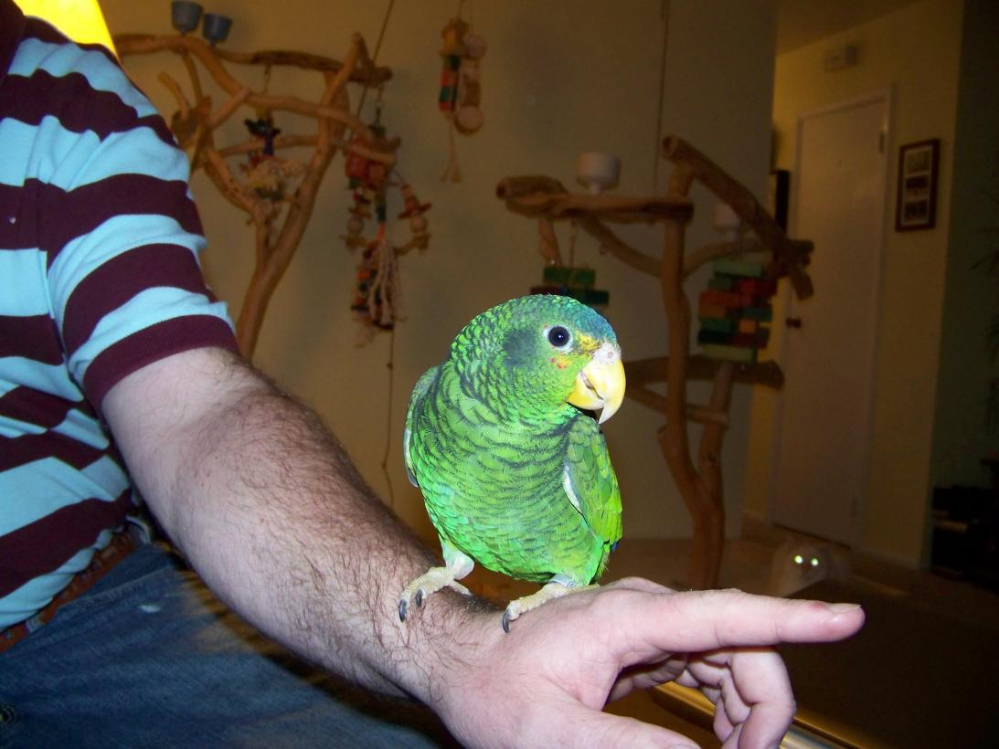 My amazon's name is George! He's a baby I purchased him two months ago from a pet store of all places! He makes the cutest noises all the time it's so cute! He eats everything and anything and so far is a sweetheart.. George is my first amazon I've been warned about the hormones! He's a male and the male will get more coloring in the face some white and there will be more red! Some of my other birds are illigers macaw, patagonian conure, and 2 sun conures!