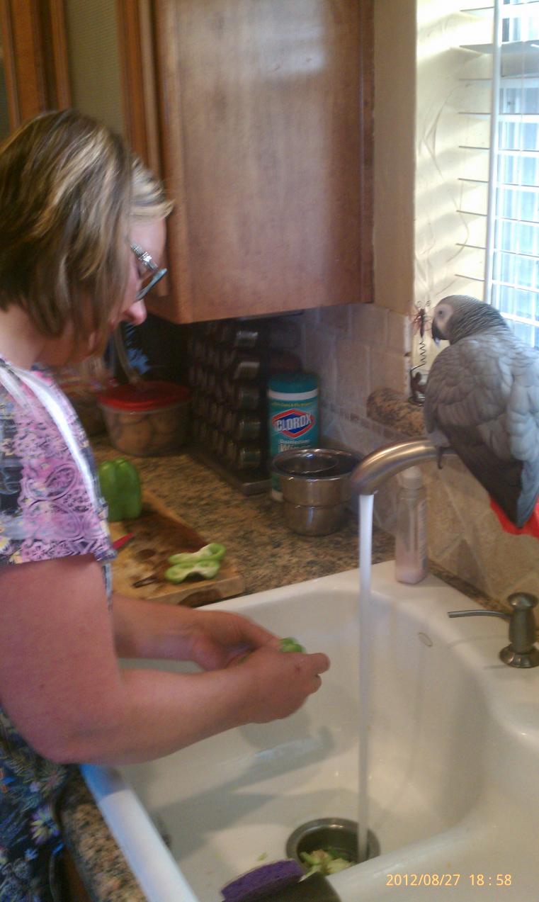 Okay, my husband calls it bonding time with me and Gabby. I call it scary and dangerious! Gabby is taken to the living room when i am cooking. Tonight however she kept flying into the kitchen and onto my shoulder while i stood frozen in front of a hot stove. Scared to turn around for fear i would scare her and make her panic and hit the frying pan or stove. We tried to stop her from this but she isn't listening so after the prep, i am afraid she will have to go to her home. She loves the prep. She will sit on the faucet and just watch until i get to something she likes, she will flutter down to the side of the sink and oh so slowly walk to the cutting board and get what she wants. It is so cute. While on my shoulder tonight, she gave me my first kiss and again a kiss when we put them to sleep. Bongo and Gabby had their first close encounter too. It went pretty well. They stood on the stand together but Bongo always moved away from her. -