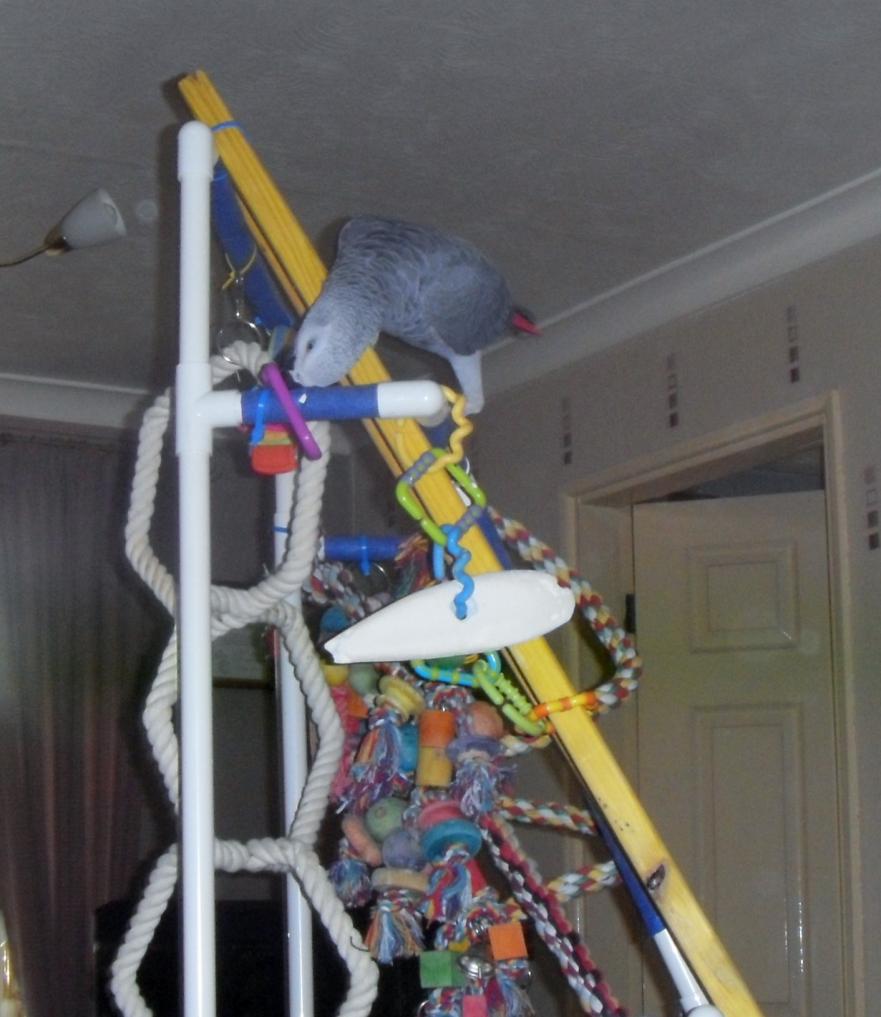 Alfie has been great today, think being 1 suits him, he played on his play stand, came and sat on the back of sofa by me asking for tickle tickle which he was given this went on for ages, he was very close to my face and I was praying this was not another one of his tricks to get me!! We have spent ages chatting and in between all this he flew back to play stand to poop on the paper below at 3 different times, barked when he could see the dogs wanted to come in from the garden, this happened twice which I throught was pretty cool, had couple of nips but I was getting him back to cage so thats fair enough, he did not think it was such a good idear to be going back. Got some videos to put on later with him playing and chatting, happy days