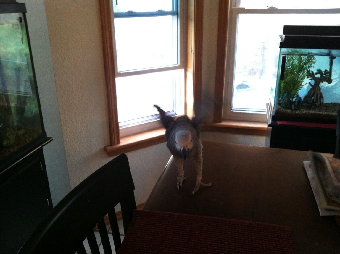 nothing special. Just exploring the dining room table. We are still back and forth with each other. He bit me last night as I was covering his cage. A first for sure for me. He is testing me, I know.:cool: Damn I love this bird!