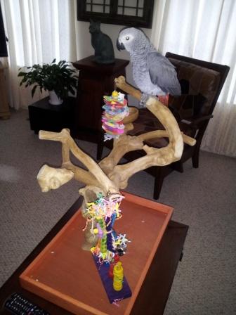 What a great morning! I had Luna playing with one of her toys on the floor this morning and I was recording it with my cell phone. And once she was done throwing the rings about she chose to walk towards me so I put my hand down and she stepped up! All on video . And it didnt end there. She has a 'natural tree' table top playstand which she only stays on the highest perch. This morning she finally decided to investigate the other branches. Defintely made my day before leaving for work. -