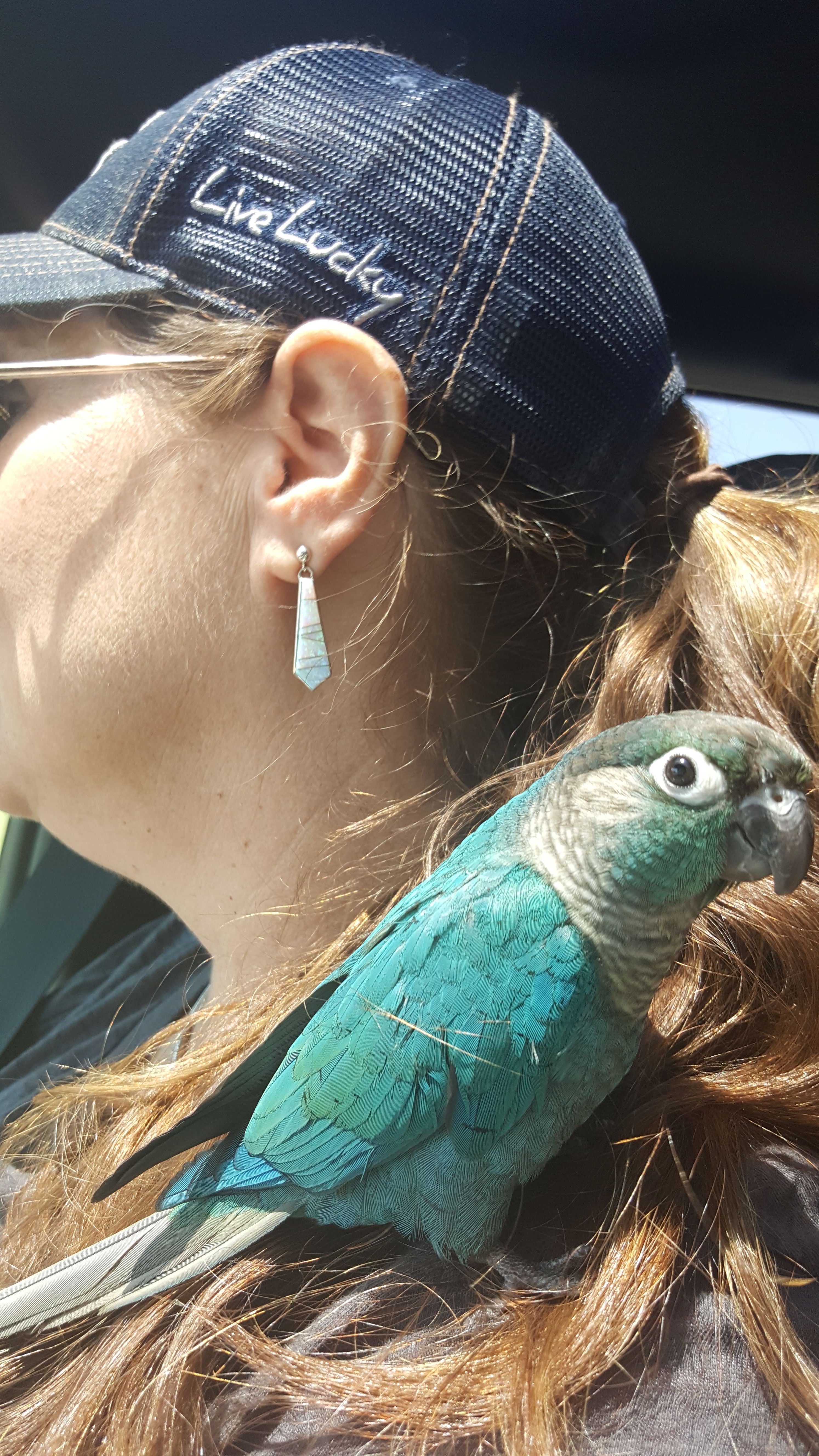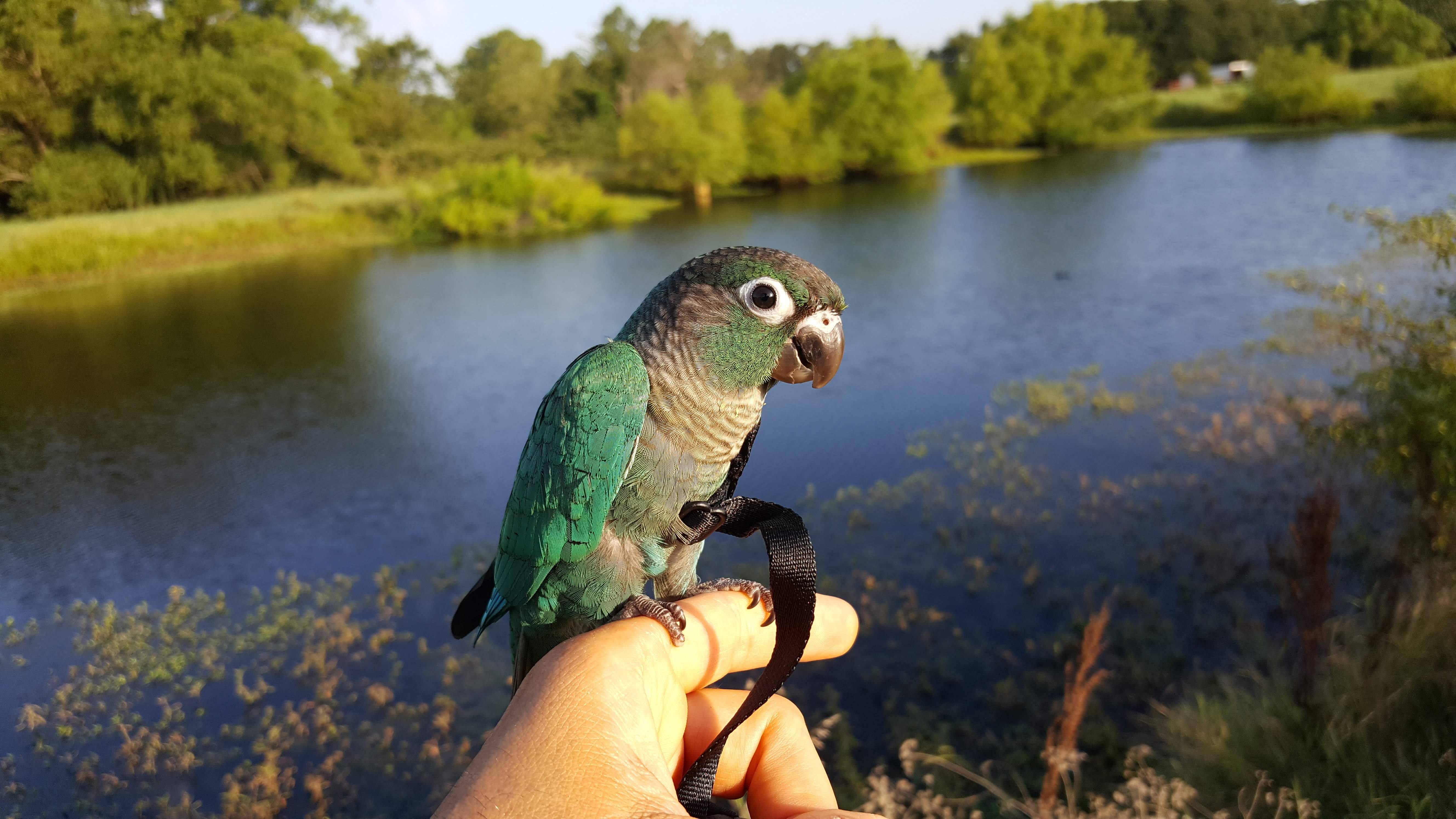 Ever'birdy meet Conner the Conure. He's approximately 11 weeks old. Turquoise conure. He was not well taken care of the first 7 weeks of his life and came to us as a wild brat of a bird. I have been working with him non-stop for 5 weeks and he's just about manageable now. This little guy came to us with a bit of a club footy. Two of his toes have been partially chewed off. He's still learning to use his left foot to hold food. He keeps trying with his damaged foot and can't hold anything. Getting better at it. He has the cutest personality. He's very spunky. Gets in fights with himself and rolls around, has rolled off my lap a couple of times and caught flight just before bouncing off the floor. He is a jibber-jabber. Never seen a conure that babbles as much as this one. I hope it turns into some talking down the road. We'll see. As mentioned, he was pretty wild when we got hold of him. Does not like human hands at all but getting better. He's still a baby so he's pretty malleable still, not set in his ways. I recently went home to visit my parents for a week and he came along so that my wife didn't have to care for him 24/7. This did wonders for gentling him down. He was with me non-stop and had to get used to me being his only company. He even went hiking in Pagosa Springs several times. Getting better in his harness too. He previously fought it non-stop. Now it's a just a little fight to get it on and off then he's fine with it. I accidentally left my pak-o-bird carrier at the house while we traveled. So I had to come up with something in the meantime. Found this little cheap rabbit carrier ($11 at petco ) that he absolutely loves. Not sure why he likes it so much because it's fairly enclosed. Must make him feel safe. He rolls around and plays in it a lot. 20190718_120018.mp4