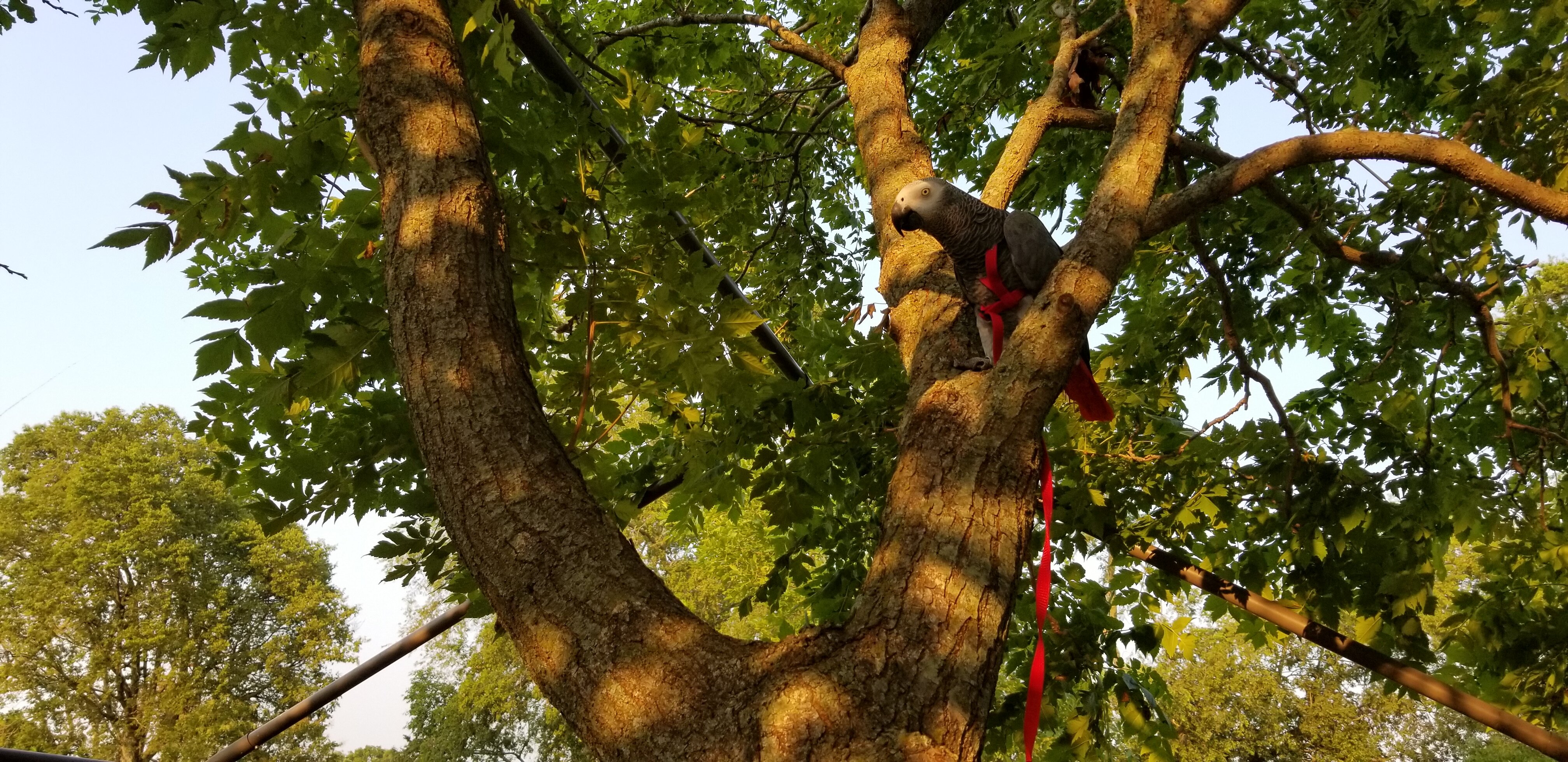 GreycieMae is sizing up her new roost. This little tree is a junk tree growing up underneath and slightly impeding the growth of a massive oak tree where I'm planning to construct Miss GreycieMae's new aviary. Going to cut the branches to where they all fit just under the top wire. It should be a real hit. Greycie will have her very own one-tree forest.