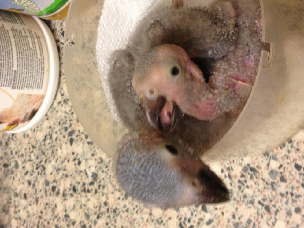2. Hey Everyone! Firstly I have to say what an awesome forum this is! Especially for soon to be owners like me! I've been browsing the forum as a guest for the last few days and I've really found the "prospective owners" thread fantastic as it has everything you could ever even think to ask prior to being an AG owner. My name is Vicky and my baby Timneh will be ready to take home from the breeder in April once he/she is fully weaned. I'm so excited and cannot wait to take him/her home. I've wanted an AG since I was a little girl and whilst I've had budgies and my family bred cockatiels I have always had a special appreciation for these beautiful birds. I love the idea of having a companion for life with the bird as I'm only 24 at the moment and recently married so it'll be nice to add another member to the family and to know that in a few years when we do decide to have children they'll grow up with the bird also. I've attached a pic as I know everyone likes a baby bird picture. Mine is the smaller of the two, it makes me laugh as I think at this age they look like little dinosaurs lol! I've read as many books and as much online as I can so far and I just need help with a few things. There isn't a specific requirement that I've seen for cages and I wanted to see if the one I like below is suitable? I have decided that I do not want to have it's wings clipped and would like to have my bird out of the cage as much as possible either on a playstand/top or with me and my husband so whilst the cage is necessary for sleeping and when I'm out I'd love to fully integrate my new bird into our family. Link to cage - http://www.ebay.co.uk/itm/Large-Bird-Parrot-Cage-Aviary-Cage-Pet-Macaw-African-Gray-Cockatiels-Portable-/400409975044?_trksid=p5197.m1992&_trkparms=aid%3D111000%26algo%3DREC.CURRENT%26ao%3D1%26asc%3D14%26meid%3D6355196922957395563%26pid%3D100015%26prg%3D1006%26rk%3D1%26sd%3D400409975044%26 I'm going to be reading up on how best to bring him/her home and introduce to the cage so still I have a lot to prepare but very excited so far. Is there anything I need to look out for or ask whilst at the breeders before I take my AG home? I'm just trying to get as much info as I can to ensure I'm the best owner I can be. Thanks for the help, I'm looking forward to getting to know my way around the forum! Vicky.