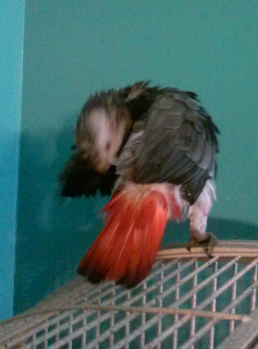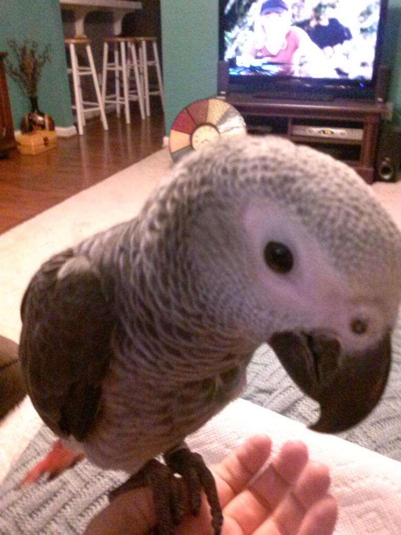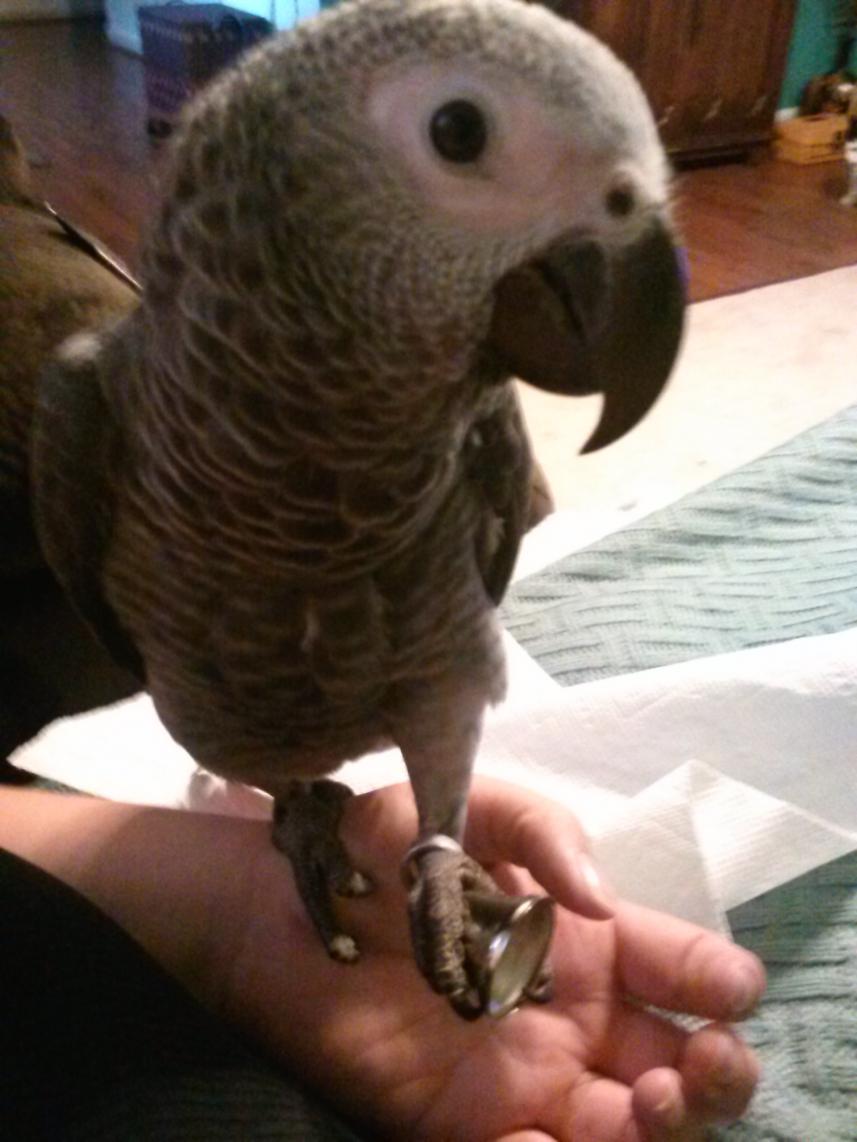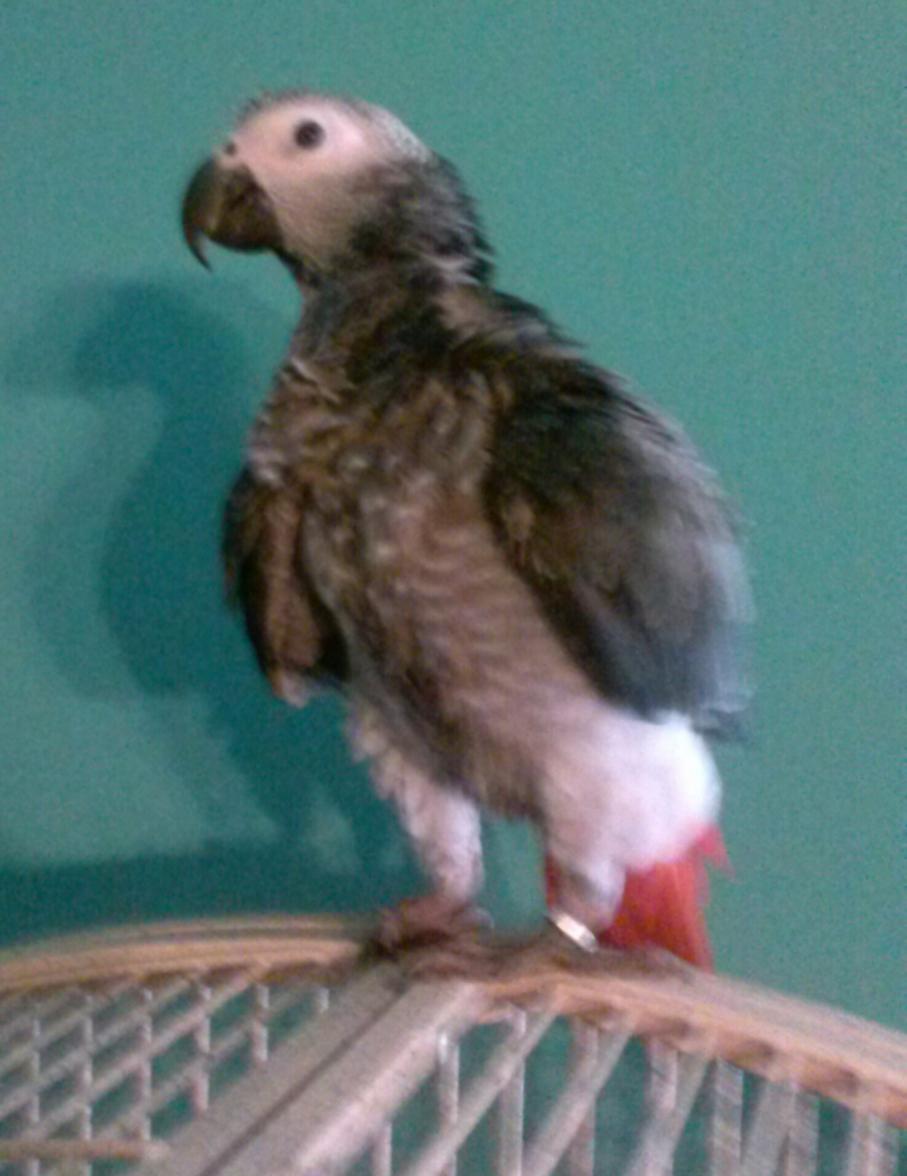 Thane is doing great :-) he is such a sweet adorable little grey. He has started eating more then just grapes finally lol he has been home for almost a month now and he is filling out a lot! Probably because he eats all the time. He is starting to get the wolf whistle probably because Yoshi my sisters SI eclectus does it all the time. He also does a lot of clicking sounds and a very deep sounding trill when he is excited which he has done since we brought him home. We are going to introduce Yoshi and Thane next week, hopefully it goes well! He is definitely not a fan of baths, he gets one once a week and i have tried every different method that i can think of. The pics are from this morning, he was a little more OK with it this morning so maybe the shower is the way to go. He has been non stop chatty since his bath lol welll in between grooming and running around growling at his toys