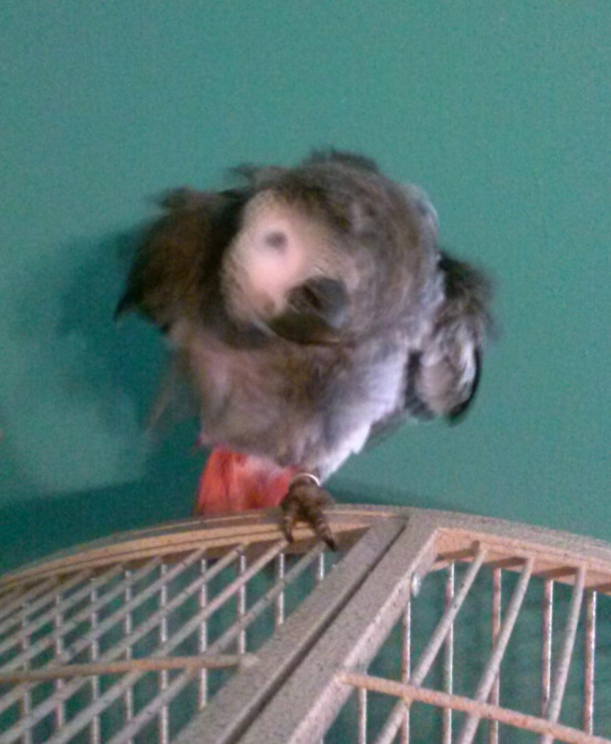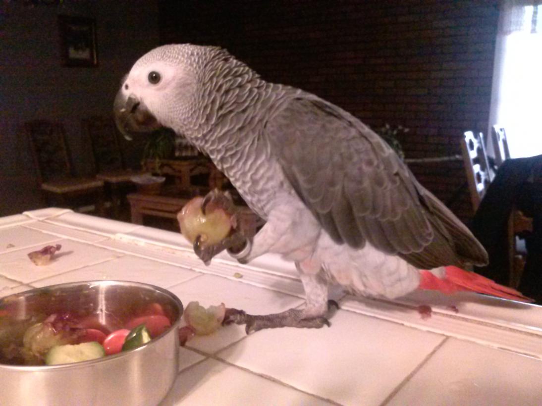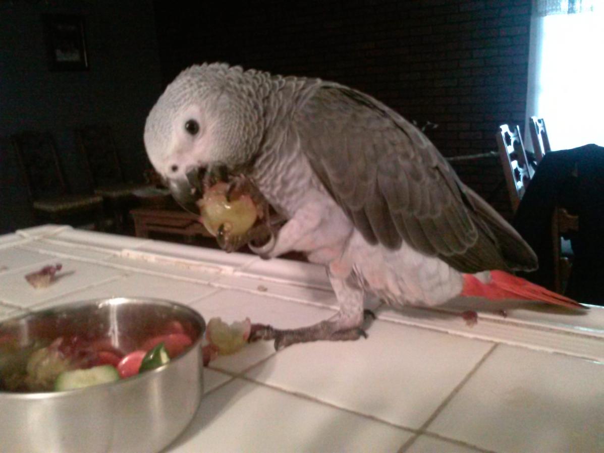 Thane is doing great :-) he is such a sweet adorable little grey. He has started eating more then just grapes finally lol he has been home for almost a month now and he is filling out a lot! Probably because he eats all the time. He is starting to get the wolf whistle probably because Yoshi my sisters SI eclectus does it all the time. He also does a lot of clicking sounds and a very deep sounding trill when he is excited which he has done since we brought him home. We are going to introduce Yoshi and Thane next week, hopefully it goes well! He is definitely not a fan of baths, he gets one once a week and i have tried every different method that i can think of. The pics are from this morning, he was a little more OK with it this morning so maybe the shower is the way to go. He has been non stop chatty since his bath lol welll in between grooming and running around growling at his toys