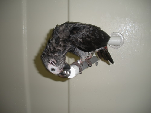 Some type of acrylic toy would be ideal for hanging from that hook, she looks like she is having a good time and getting thoroughly wet in the process, thanks for sharing the pics with us.