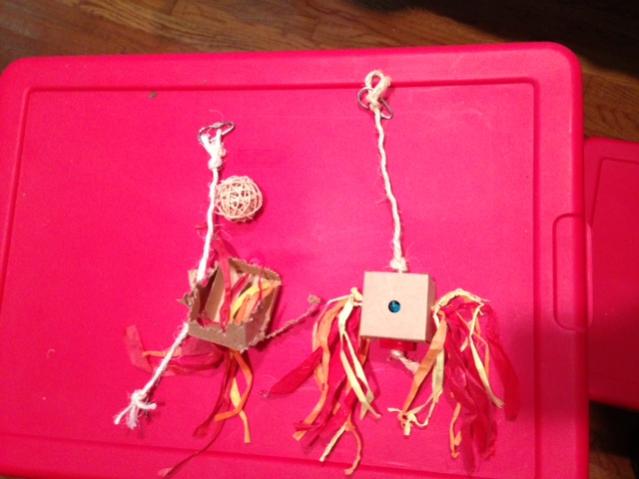 katana600 Posted November 11, 2013 Author Posted November 11, 2013 Often, the attempt is made to video a clip of Gilda as she accomplishes some "firsts" in our relationship. In less than two days she has totally destroyed a new toy. While I couldn't risk intruding and changing the dynamics by trying to get a video, I did get a picture of before and after. I put a new one in place of the one she already has accepted and it will be interesting to see if she goes back for seconds, or if its a been there, done that kind of thing. All I know is that looking at the picture doesn't convey the monumental stride this has meant for her development. As we watch her from a short distance, we are mesmerized by her every growing confidence. She has been hanging by one toe, gyrating wildly and boisterously for the first time in at least six years. She is just one step away from climbing on a swing attached to her floor stand and stabilized to keep from being "too much too soon". She also deliberately and with planning and forethought launched herself off her cage twice yesterday. She descended gradually at less than a 30 degree angle, sustained for over twenty feet. She wasn't distressed at all, just calmly turned around, climbed to the top of her cage and did it again. I think we are at the cusp of her gaining independence and courage. This one small toy doesn't look like a big deal, but it represents an amazing recovery of her finding her place in the world.