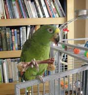 Pancho is settling in nicely. We brought Pancho's cage downstairs when we found out Pancho was negative for disease. Brutus, our African Grey, learned Pancho's name in one day. I think he feels a little threatened because he says, "Brutus and Pancho" several times, but, he ends with something he made up, which is "Brutus and Mama." He needn't worry, however, as Pancho clearly prefers my husband. We are not forcing anything with Pancho. He comes out of his cage when he is willing to step up. When I have trouble getting him back in the cage with my hands, he happily steps up on a stick, so this is nice. The big surprise is after years of a 100% seed diet he is eating practically everything I offer him. He has eaten: pomegranate seeds, apple, orange, english peas (not a favorite), mango, corn, chicken bone, salmon, bean burrito, and cheese. He takes food willingly and easily when he is hand fed, but still avoids his fresh food bowl. He ate the chicken bone like he had been eating them forever. He talks a little. He says, "Hello Pancho, Pancho, Hey Pancho, and my husband thinks he heard him try, "let's go outside" but, I dunno. This would be a new phrase for him, and if this is true, very exciting! We are encouraged by the amount of progress he has made in such a short time (1.5 weeks). He is still a little skittish when he hears unfamiliar noises, but who could blame him. He has played with a few toys which makes us very happy!