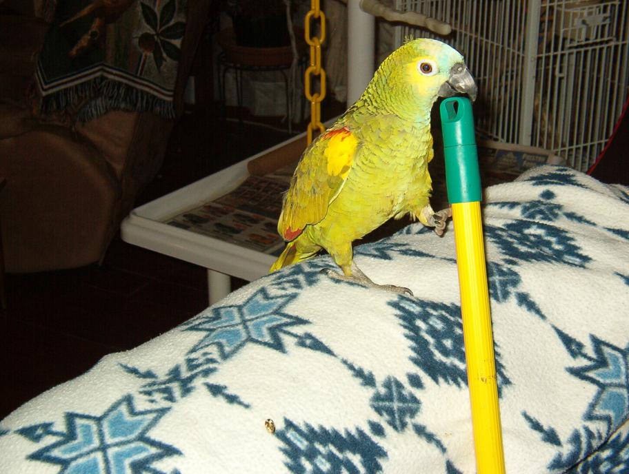 One day when she was on top of her cage I left my stool to do something on the other side of the room and she flue after me but she was still very over weight and went right to the floor. At this point I had never held her and when I bent over to pick her up I was ready for a bad bite. I bent over and said step up and she did.