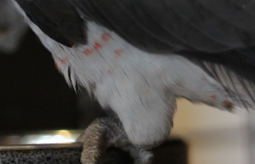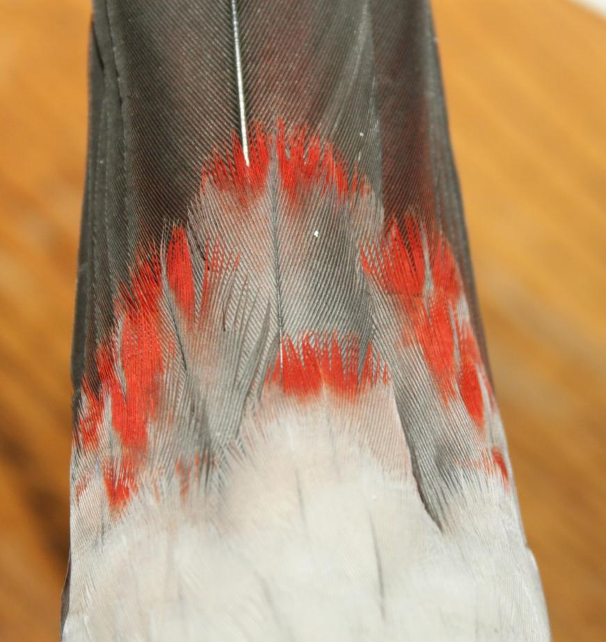 Doug Posted October 25, 2011 Author Posted October 25, 2011 Here's a picture of Ellie's tail feathers, showing the dark gray of the main feathers and the red-tipped feathers above the main feathers... As you can see, the dark gray tail feathers have a bit of red.