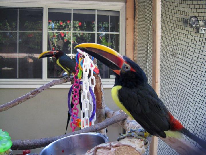 Sarasota Posted July 21, 2012 Author Posted July 21, 2012 Let's see if I can answer all the questions in one post. How do they compare to parrots? They are MUCH more active than parrots. Think of a mockingbird or jay. They are that fast and love to hop from perch to perch. This is not true of the larger toucans - more the aracaris and toucanets...and even that varies. I'm not so sure I was categorize them as "good" pets. Most of the message boards are full of people with very young birds. Rarely do you see posts from older aracari owners - similar to parrots in some respects. Once the breeding hormones kick in and you have an aracari fly at your face one or two times, some people give up. Their diet can be very demanding - especially in areas where there is not an abundance of fresh fruit. Their daily diet consists of papaya, bananns, apples, melon, grapes, raspberries, blueberries, cucumber (yes, even if it's out of season), Mazuri pellets and/or Zoo Life Gel. Chopped fresh, everyday (sometimes twice a day if it spoils). You get the idea, it can be a lot of work. The beak CAN hurt. The collard aracaris and chestnut-eared, for example, can clamp down pretty hard. I've had to pry one off my hand before during grooming. And when they hammer you with the beak, it's not the greatest (watch our for lips, earlobes). Still, they aren't going to break your finger like a macaw might. Cages must be large. Very large. Mine are housed in 8 X 4 X 6. Walls and floors get splattered with blueberies (how DO they get it on the ceiling??) I was volunteering at Project Wildlife in San Diego (avian rehab). It was baby season and I was working in the baby room handfeeding. I got pretty good at it and had the chance to handfeed toucans (all varieties) at a facility in Fallbrook. There was a little guy that kept jumping out of his cage and hanging onto my shirt when I went to feed them. When I left, I took him with me. Mollie came later to keep him company - don't we always get our bird a bird?? 1