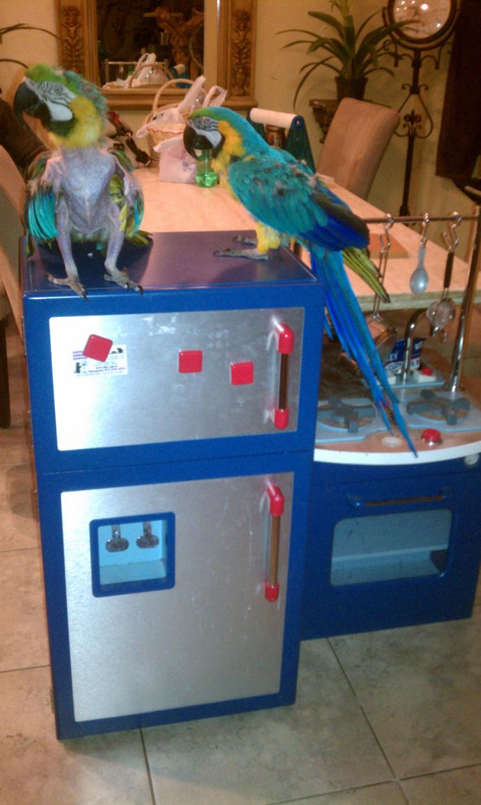 murfchck Posted August 21, 2012 Author Posted August 21, 2012 Bubba had to go to the vet yesterday morning as a drop off. His butt was pretty bad and he started grunting again but this time nothing was coming out. He had to cut off the remainder of the cyst and then push the rest back in. As soon as he did that Bubba pooped a big un. Vet said that there was so much old stuff in him that it all came out and stunk to high heaven. Glad it happened with the vet! He will be very sore and the thing may pop out again but if it does we are to push it back in. He is on an antibiotic cream three times a day. Recheck in three weeks, he seems to think he got the bulk of it and that the rest will go away on its own in a week or two. He said he wouldn't freeze again but if he has to remove the rest he will have to knock him out this time as it is on the inside but doesn't want to do that unless it becomes a must because he doesn't like to knock out birds. They said also they were going to call the lab and get his results for us today. Fingers crossed it is good news! While out killing time before picking up Bubba my husband found a childs kitchen set that wanted to get for Gabby, our terror in the kitchen CAG. He wanted to convert it into a stand for her in our kitchen area where she always flys to. Welp that didn't work the way he planned at all.