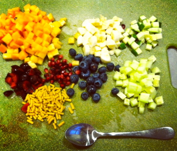Sarasota Posted August 20, 2012 Posted August 20, 2012 I've had a few questions about what Toucans/Aracaris eat compared to parrots (and about poop!). Here's a few photo examples... It has to be all fresh fruit. Today's meal is papaya, cherries, squash, cucumber, blueberries, banana and Mazuri softbill pellets. I'll also feed apples, mangos, pear, various melon and some grapes. Every so often I'll feed them a little scrambled egg cooked in RPO. Note: That's one daily portion for two Aracaris. The male is 159 grams, the female 143. They are roughly the size of a Western Scrub Jay. I'd guess they eat double their weight in fruit and pellets everyday. Their digestive tracts are SUPER fast. What goes in, comes out almost immediately. Yep, that's a pile of blueberry poop at the end of the day under a perch. And, they manage to spray the wall which is about 8 inches away from their cage. And its fruit, so it's pretty sticky.