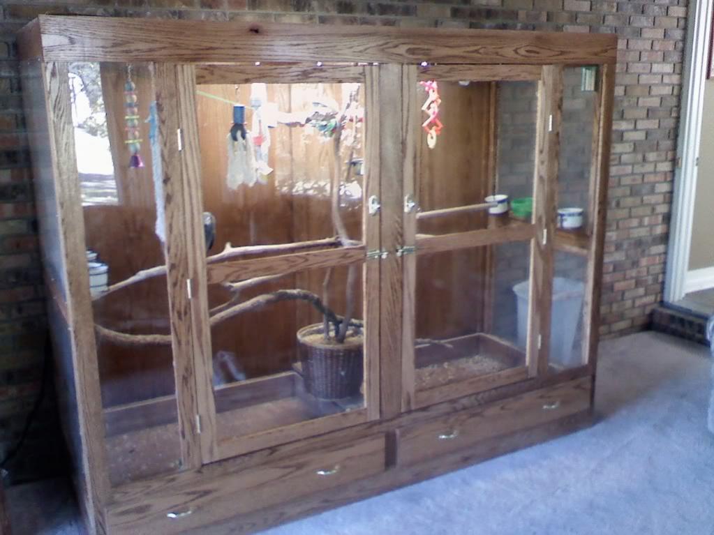 My father built this aviary for them as a Christmas present for my wife and since not having the birds it has been in storage in our basement. Since we have no plans on getting any more parrots, we desperatly need the storage space in our basement. It measures 90" long X 70" high X 33" deep. it is made of oak and it very heavy. The front doors have glass inserts. The top and sides are covered with wire mesh and the sides with covered with plexiglass. The bottom has cleanout drawers.