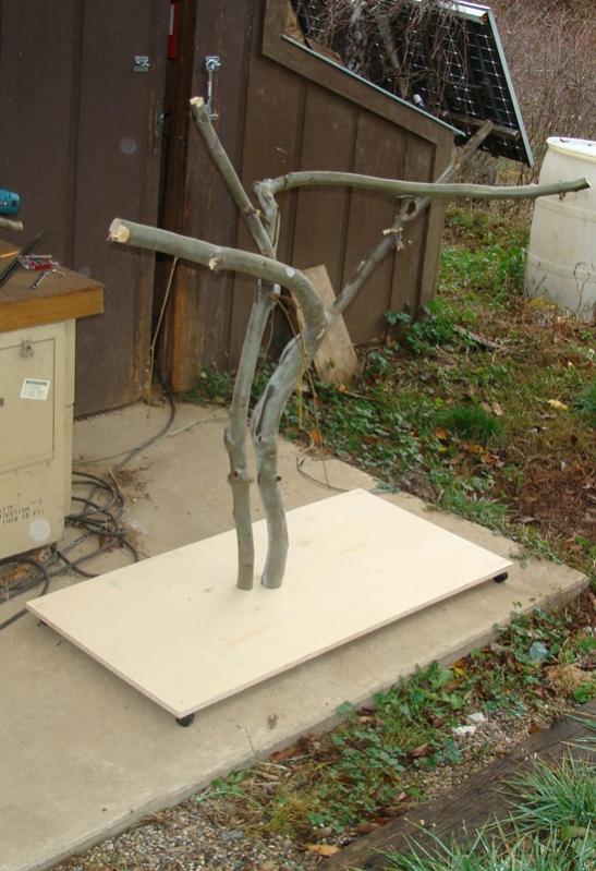 NOT A GREY Posted November 20, 2012 Posted November 20, 2012 the tree cutters left behind some pretty sycamore tree tops. we tried to make sure our stand height was shorter then our shortest human. we still need some toys attached. but it has wheels and a nice base to catch all the bird fun lol!