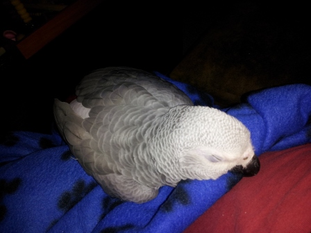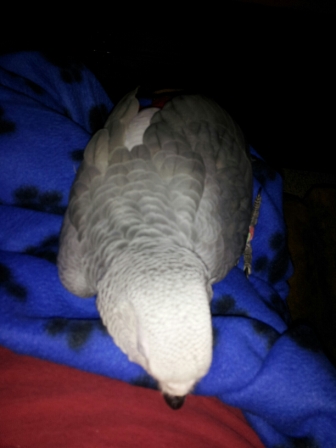 MiracleAces Posted December 20, 2012 Posted December 20, 2012 Hi everyone. I haven't really done much on here since introducing myself and Luna earlier last month. Back on the 13th my poor girl broke her leg. The vet thinks her ID ring got caught on something. Oddly enough Luna was born in the U.S., but she had the 'open' ID ring (not the solid one) which would indicate she was transported into the U.S. which I was told is illegal now. Anyway... they had to cut the ring off so they could splint Luna's leg. The splint is big and long making Luna's movement very difficult. They believe she may have some nerve damage in her toes. I am taking her in for her follow up appointment in the morning. The reason I am posting about this is that as unfortunate as this has been and my heart breaks for Luna everytime I see her unable to move or to lift a peanut (I now open them for her and hand her the pieces that fall), this situation has brought us very close. Luna is now about 19 weeks old. We have had her for about a month and she was always very friendly. Now however, her dependence on me has brought us somewhere we may never have gone. She still likes her alone time to do what she can. However each night I take her into her blanket and set her on my chest. She leans sideways to take the pressure off of her one good leg and her broken leg is sort of swung backwards with no pressure on it as well. I then pet her until she falls asleep. It started with her sleeping on my lap. Now she has pulled herself up under my chin where she rubs her head and beak under my chin and slowly falls asleep with her head on my chest. I never would have imagined being this close so quickly. Luna is definitely a strong willed Grey and I'm proud of how well she is coping. Hopefully the splint will be off three more weeks from now. I did have one of those cones on her, but she knows how to unsnap it! So no use keeping it on her. She has mostly stopped picking at the splint.