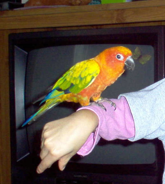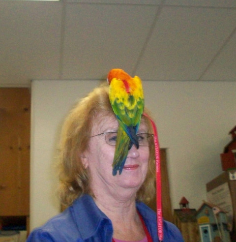 Brat Birds Posted April 18, 2013 Posted April 18, 2013 Hi I am Skittles, a Sun Conure. My first family bought me on a whim and soon found out I was nippy and made much too much noise for them. I was very lucky in that they wanted me to go to a good home. That is how I ended up with a friend of their parents. She loves me and I love her - from the first moment we met. She likes my yelling a few times a day and she doesn't mind my mess and since I have her companionship I am not at all nippy (of course, except for my first hormonal season I did bite her more than a few times then - but she still loves me!) I can say Hello when the phone rimgs, Thank you when I get something I love to eat, Stop when I, or Mom, does something wrong and I called our dog, Oscar, when he was with us. He has gone to the rainbow bridge now. I love to cuddle into my Mom's neck, or go down the front of her shirt and cuddle there. I also will sleep under a blanket with Mom at night sometimes. I use to sleep there every night but I have changed and only do it once in a while now. I love ice and once got a beak full of coke fuzz - you know that stuff that fills the glass when you pour coke. I L O V E coke, but don't get it because Mom says it is bad for me. One of the pictures show me on my Mom's granddaughter's arm. Another shows me after a shower - all wet! Another shows me playing with my 'big' brother, Peanut. The last one shows me on my aunt's head at one of our school visits - don't I make a beautiful hat! LOL